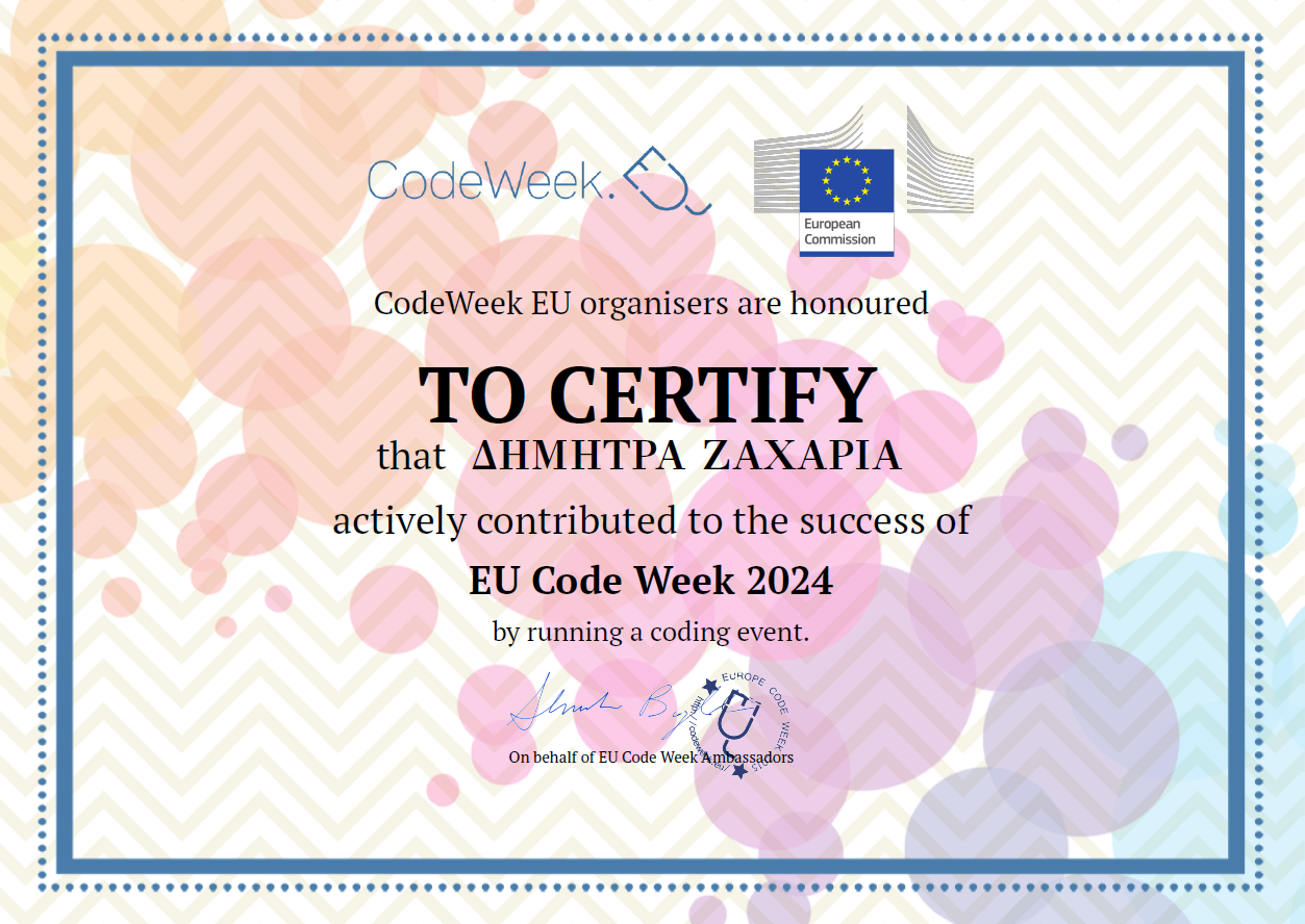 Για τη συμμετοχή τους στην εβδομάδα Προγραμματισμού οι εκπαιδευτικοί και οι μαθητές του σχολείου μας έλαβαν Πιστοποιητικό Συμμετοχής.