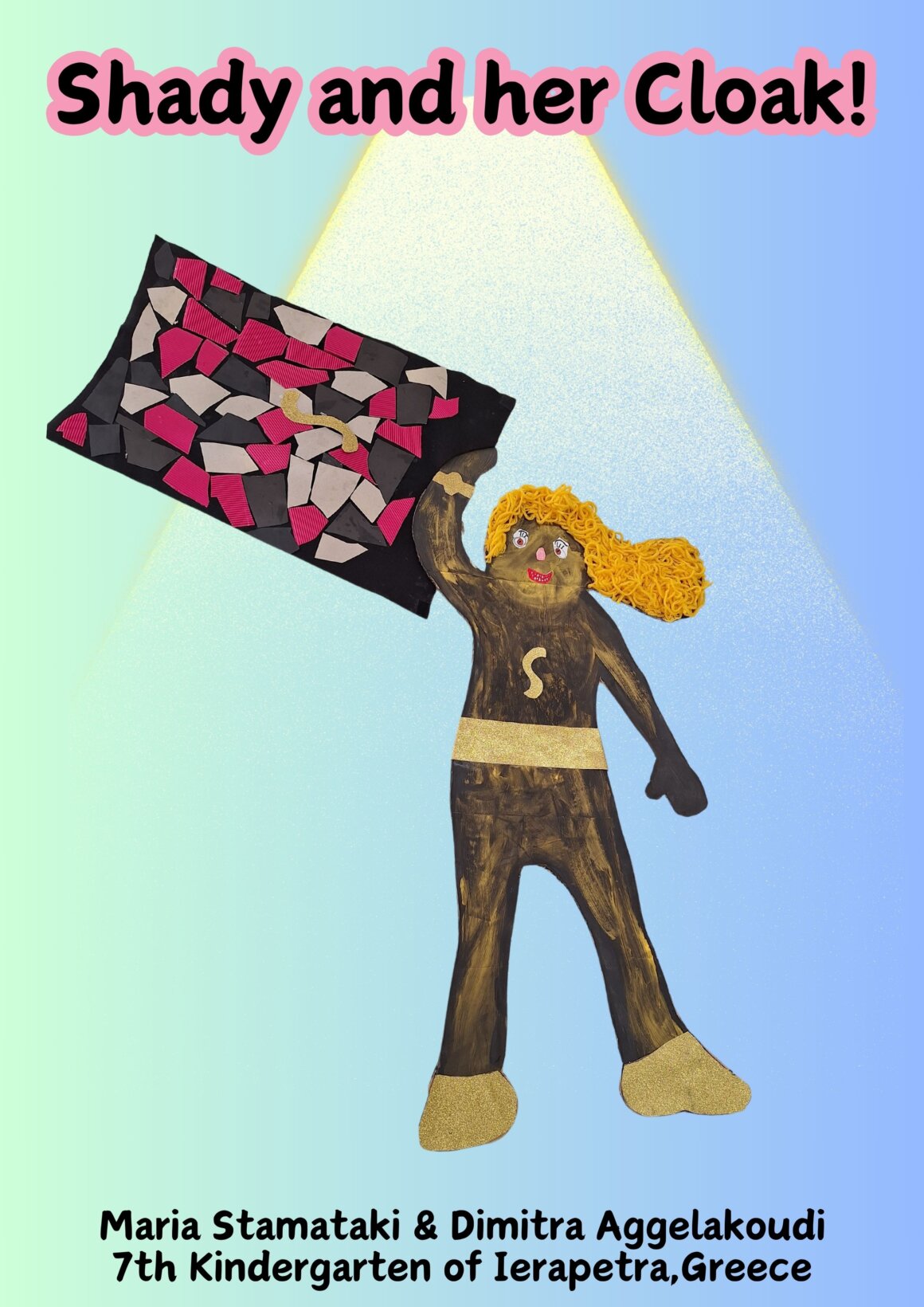 Όμως πώς φανταζόμαστε τη Sahdy; Πώς μπορεί να μοιάζει; Εμείς τη φανταζόμαστε ένα σούπερ παιδί σαν εμάς, γι’ αυτό κάναμε το μοντέλο για το σχήμα της! Είναι μαύρη σαν σκιά και χρυσή φαν δυνατό φως. Σχεδιάσαμε, κόψαμε και κολλήσαμε μάτια, μύτη και στόμα. Τα μαλλιά της φαίνονται ξανθά στο φως…Για να φτιάξουμε τον μανδύα της χρησιμοποιήσαμε μαύρο παχυ ύφασμα και προσθέσαμε υλικά που φέραμε από το σπίτι και δοκιμάσαμε να μην αφήνουν καθόλου φως. Είναι η παρέα μας και μαθαίνουμε μαζί της πολλά πράγματα για το φως και τις σκιές!