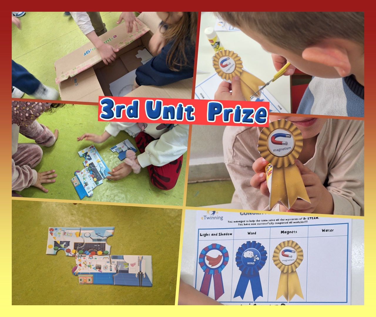 Στο τέλος της ενότητας, ο Dr Steam μας αντάμειψε για την εξαιρετική δουλειά μας. Mε χαρά παραλάβαμε ένα κουτί που περιείχε όμορφες εκπληξεις! Δυο κομμάτια παζλ για να ανακαλύψουμε το εργαστήριό του, ένα μεγάλο βραβείο Magneta για την τάξη μας και μικρότερα για να το κολλήσουν οι μαθητές μας στην καρτέλα βραβείων του Dr STEAM. Είμαστε τόοοσο περήφανοι!