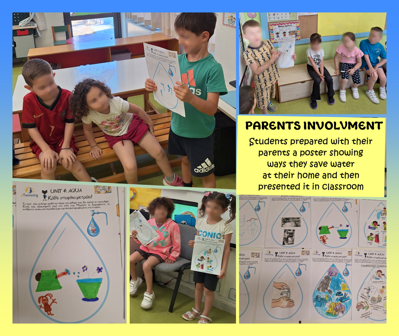 - Νερό, ένας πολύτιμος πόρος. Εμπλοκή Γονέων: Ανάμεσα σε άλλα μάθαμε ακόμη ότι το νερό είναι πολύ πολύτιμο αγαθό και ένας πόρος που δεν είναι ανεξάντλητος. Γι’ αυτό συνειδητοποιήσαμε πως δεν πρέπει να το σπαταλάμε. Σε αυτό μας βοήθησαν οι γονείς μας με τους οποίους συζητήσαμε τρόπους που μπορούμε στο σπίτι μας εξοικονομούμε νερό και προετοιμάσαμε μια αφίσα. Σε επόμενη φάση τους παρουσιάσαμε στην τάξη και έτσι ανταλλάξαμε πολύτιμες ιδέες για να εξοικονομούμε νερό. Γονείς σας ευχαριστούμε!