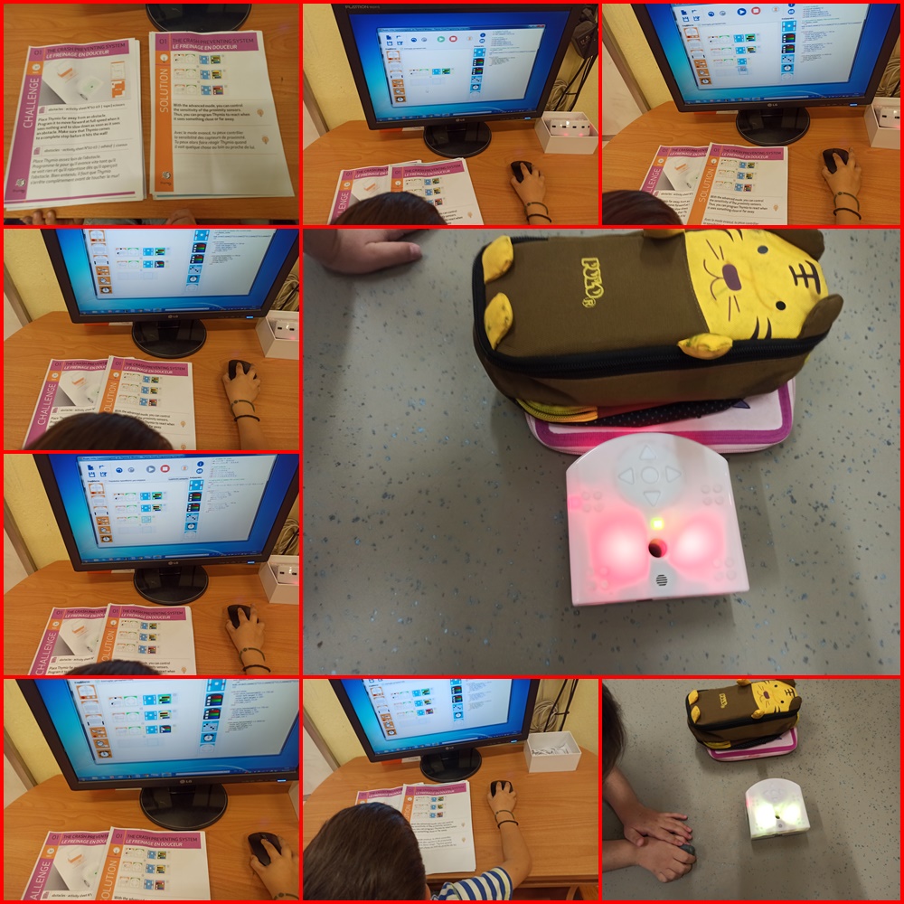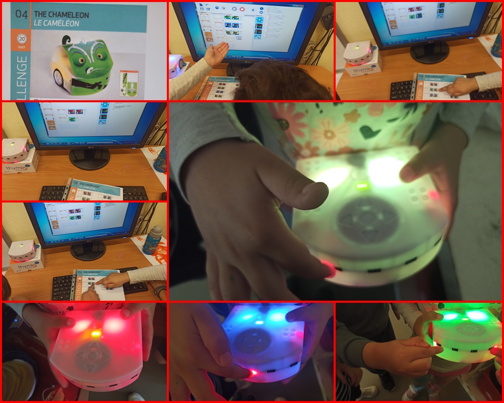 Ολοκληρώνοντας τις δράσεις μας για το ουράνιο τόξο ήρθε η ώρα να γνωρίσουμε το ρομπότ thymio, χρησιμοποιώντας μερικές από τις προτεινόμενες δράσεις των “challenge cards” χρησιμοποιώντας την εφαρμογή thymio suite-VPL. Συγκεκριμένα δοκιμάσαμε τις δράσεις ” THE CHAMELEON”, “THE CAREFUL DRIVER”, ” THE PIANO”,  “THE BUZZER”, “THE CRASH PREVENTING SYSTEM”. Οι μικροί μας μαθητές είχαν την ευκαιρία να εξοικειωθούν με τη λειτουργία drag and drop και την επιφάνεια προγραμματισμού (VPL), να εξοικειωθούν με μερικές από τις λειτουργίες του thymio, να αντιληφθούν πως ο κώδικας μεταφράζεται σε συγκεκριμένες κινήσεις και συμπεριφορές του thymio (όταν διαλέγω αυτό το εικονίδιο τότε το thymio κάνει αυτό-API)
