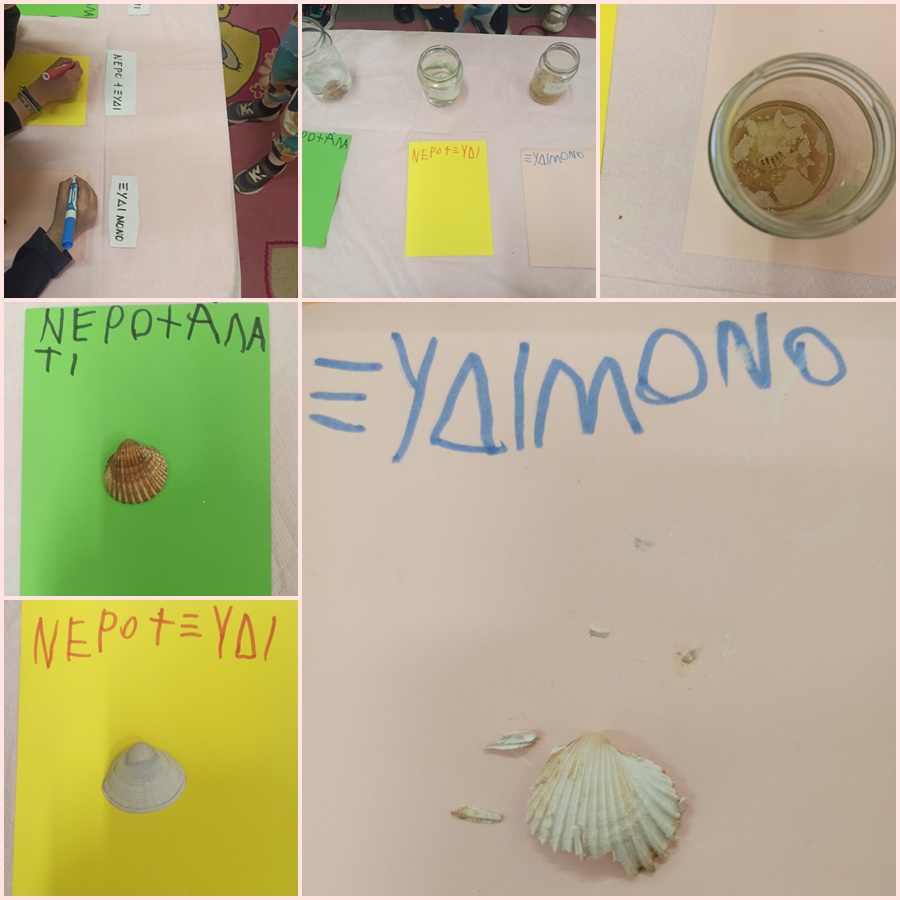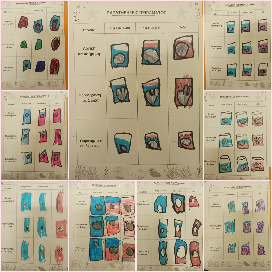 το κοχύλι στο νερό δεν έπαθε τίποτα, το κοχύλι στο νερό με το ξύδι παρουσίασε αλλοίωση στην επιφάνεια του. Όταν το αγγίξαμε έβγαλε στα χέρια μας μία άσπρη ουσία που έμοιαζε με κιμωλία. Τέλος το κοχύλι που βυθίσαμε σε ξύδι καταστράφηκε. Το ξύδι είχε αφρό στην επιφάνεια του ενώ το κοχύλι θρυμματίστηκε. Αυτές είναι οι συνέπειες της οξίνισης της θάλασσας στα θαλάσσια πλάσματα που έχουν κέλυφος. Όπως χαρακτηριστικά είπαν τα παιδιά “Τα κοχύλια χαλάνε και πεθαίνουν γιατί δεν έχουν σπίτι”