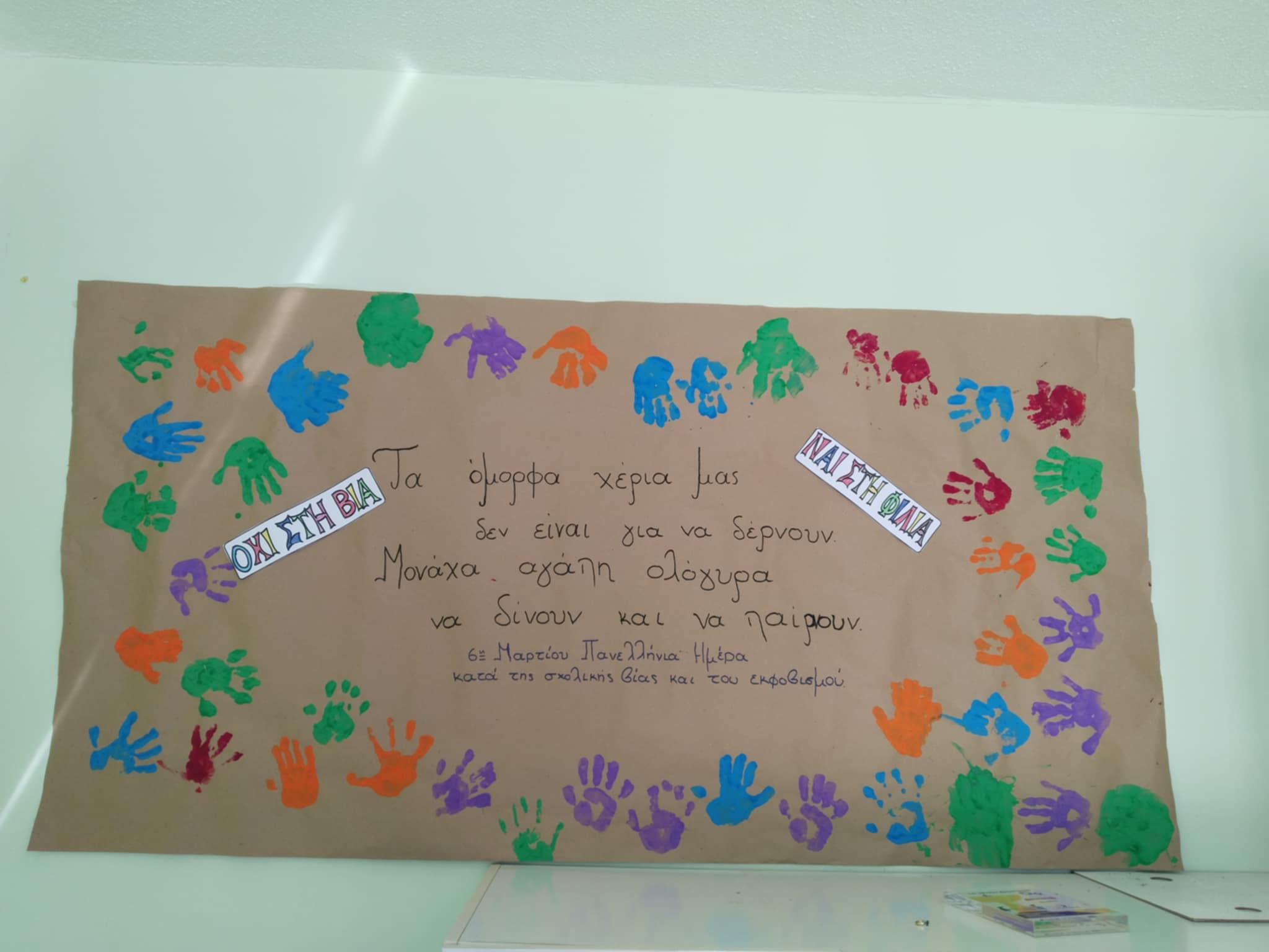 Όλοι οι μαθητές του σχολείου μας συγκεντρώθηκαν στην αυλή δημιουργώντας ένα πανό φιλίας  και φωνάζοντας συνθήματα κατά της σχολικής βίας και του εκφοβισμού προκαλώντας ευαισθητοποίηση και ενεργοποίηση.