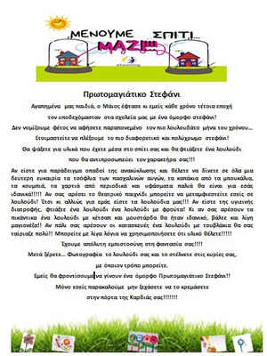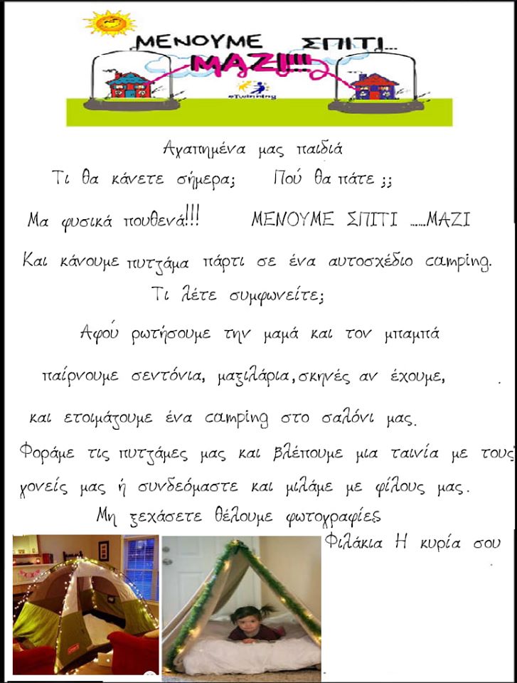 Το σχολείο μας συμμετέχει στο eTwinning πρόγραμμα με τίτλος “Μένουμε σπίτι…μαζί”. Το πρόγραμμα οργάνωσαν και πλαισίωσαν με ευφάνταστες δράσεις και μία πληθώρα πρωτότυπων web 2.0 εργαλείων, δύο εξαιρετικές συνάδελφοι οι Μαρίνα Ζαχαρία και Αριάδνη Ευαγγελοπούλου. Στο πρόγραμμα συμμετέχουν 225 σχολεία από Ελλάδα, Γερμανία, Ρουμανία και Βουλγαρία, 302 εκπαιδευτικοί και πάνω από 4800 μαθητές. Όπως χαρακτηριστικά αναφέρει η ιδρύτρια του έργου Μαρίνα Ζαχαρία ” Στη δύσκολη περίοδο που διανύουμε, λόγω της πανδημίας που ταλανίζει τη χώρα μας, δημιουργούνται ιδιαίτερες εκπαιδευτικές και μαθησιακές ανάγκες, με κυριότερη την ενεργοποίηση των μαθητών/μαθητριών και εκτός σχολικής τάξης, το χρονικό διάστημα κατά το οποίο θα παραμείνουν κλειστά τα σχολεία. Με το έργο “Μένουμε σπίτι”, οι εκπαιδευτικοί και μαθητές όλης της χώρας επικοινωνούν και εκφράζονται, σε μια προσπάθεια να ξεπεράσουν μαζί την κρίση που βιώνουν”.