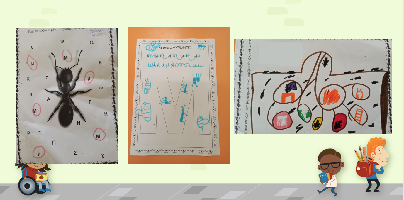 Διαβάσαμε το ποίημα των Philip and Hannah Hoose «Ει μικρό μυρμήγκι» ένα ποίημα για τον σεβασμό και την ενσυναίσθηση, και τα παιδιά ζωγράφισαν και υπαγόρευσαν τις απόψεις τους, λύσαμε λαβύρινθους, ζωγραφίσαμε μυρμηγκοφωλιές, παίξαμε τρίλιζα, μάθαμε το Μ από το μυρμήγκι