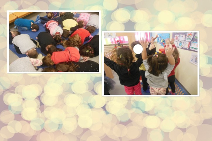 Γίναμε σποράκια και αναπαραστήσαμε την ανάπτυξη τους συνοδεία μουσικής .Σιγά σιγά και με αργό ρυθμό αρχίσαμε να ψηλώνουμε. Χρειαζόμασταν ήλιο ,νερό, και να μην περάσει από πάνω μας κανένα πόδι ή ρόδα … Αν είμαστε τυχεροί μετά από χρόνια θα γίνουμε ένα ωραίο δέντρο.