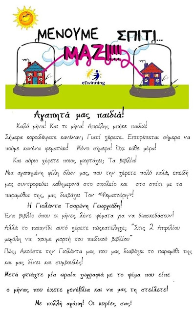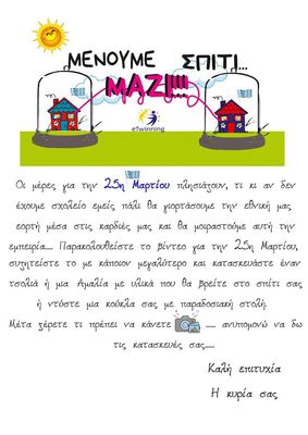 Το σχολείο μας συμμετέχει στο eTwinning πρόγραμμα με τίτλος “Μένουμε σπίτι…μαζί”. Το πρόγραμμα οργάνωσαν και πλαισίωσαν με ευφάνταστες δράσεις και μία πληθώρα πρωτότυπων web 2.0 εργαλείων, δύο εξαιρετικές συνάδελφοι οι Μαρίνα Ζαχαρία και Αριάδνη Ευαγγελοπούλου. Στο πρόγραμμα συμμετέχουν 225 σχολεία από Ελλάδα, Γερμανία, Ρουμανία και Βουλγαρία, 302 εκπαιδευτικοί και πάνω από 4800 μαθητές. Όπως χαρακτηριστικά αναφέρει η ιδρύτρια του έργου Μαρίνα Ζαχαρία ” Στη δύσκολη περίοδο που διανύουμε, λόγω της πανδημίας που ταλανίζει τη χώρα μας, δημιουργούνται ιδιαίτερες εκπαιδευτικές και μαθησιακές ανάγκες, με κυριότερη την ενεργοποίηση των μαθητών/μαθητριών και εκτός σχολικής τάξης, το χρονικό διάστημα κατά το οποίο θα παραμείνουν κλειστά τα σχολεία. Με το έργο “Μένουμε σπίτι”, οι εκπαιδευτικοί και μαθητές όλης της χώρας επικοινωνούν και εκφράζονται, σε μια προσπάθεια να ξεπεράσουν μαζί την κρίση που βιώνουν”.