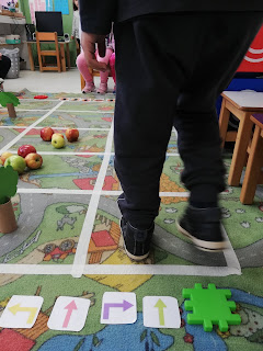 Σχηματίσαμε τρεις ομάδες. Η κάθε μία καλούνταν να σχεδιάσει τον προγραμματισμό της διαδρομής έως τα μήλα, αποφεύγοντας τα εμπόδια (δέντρα).