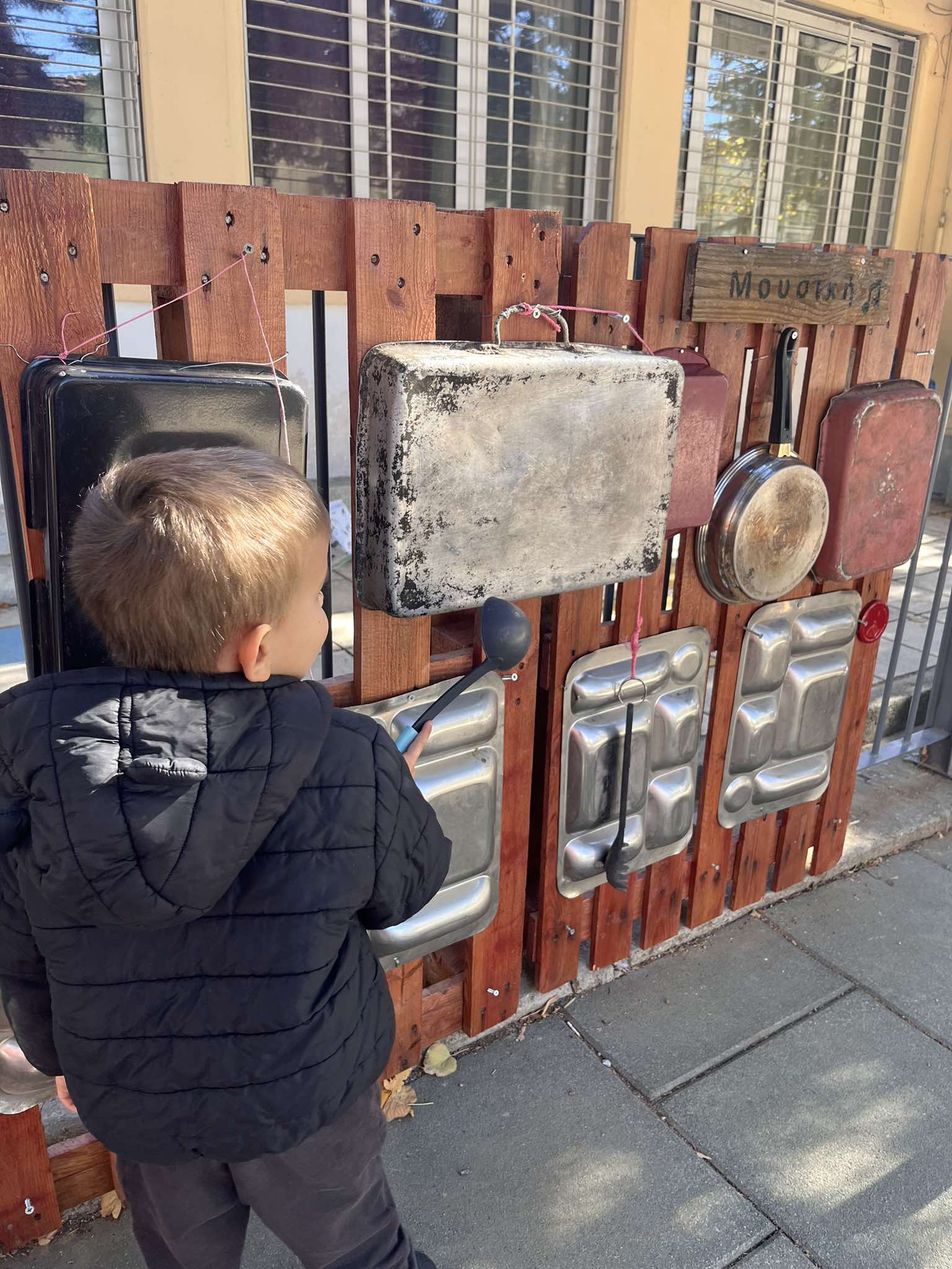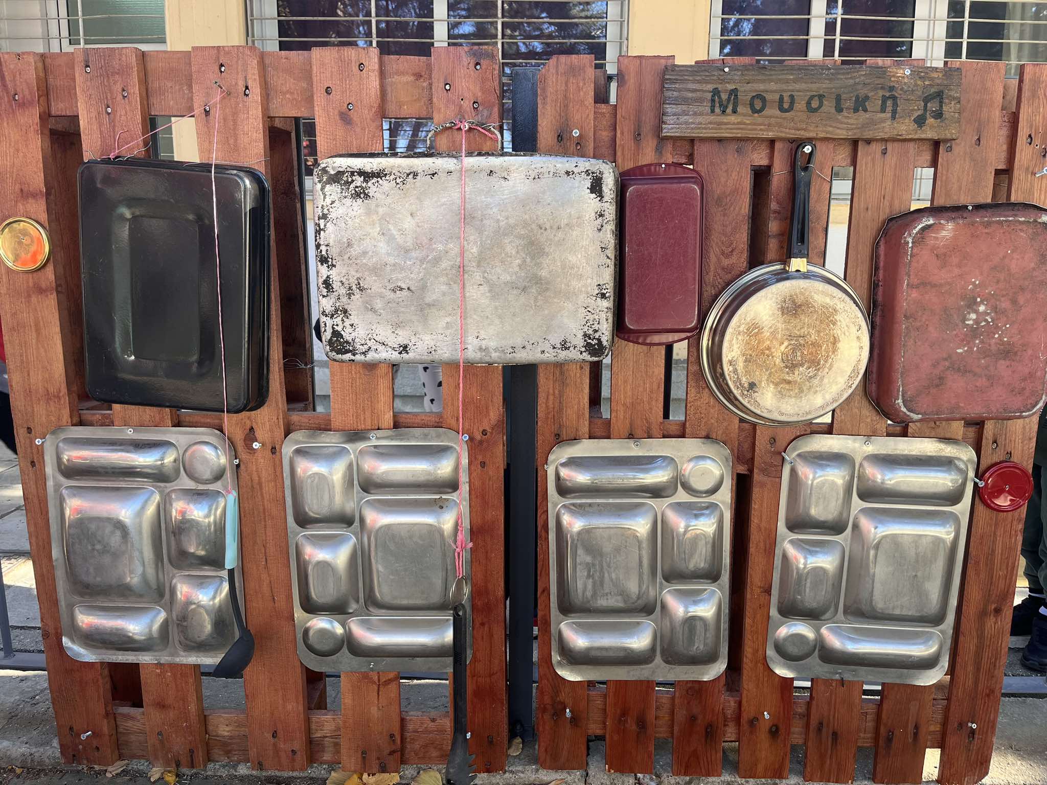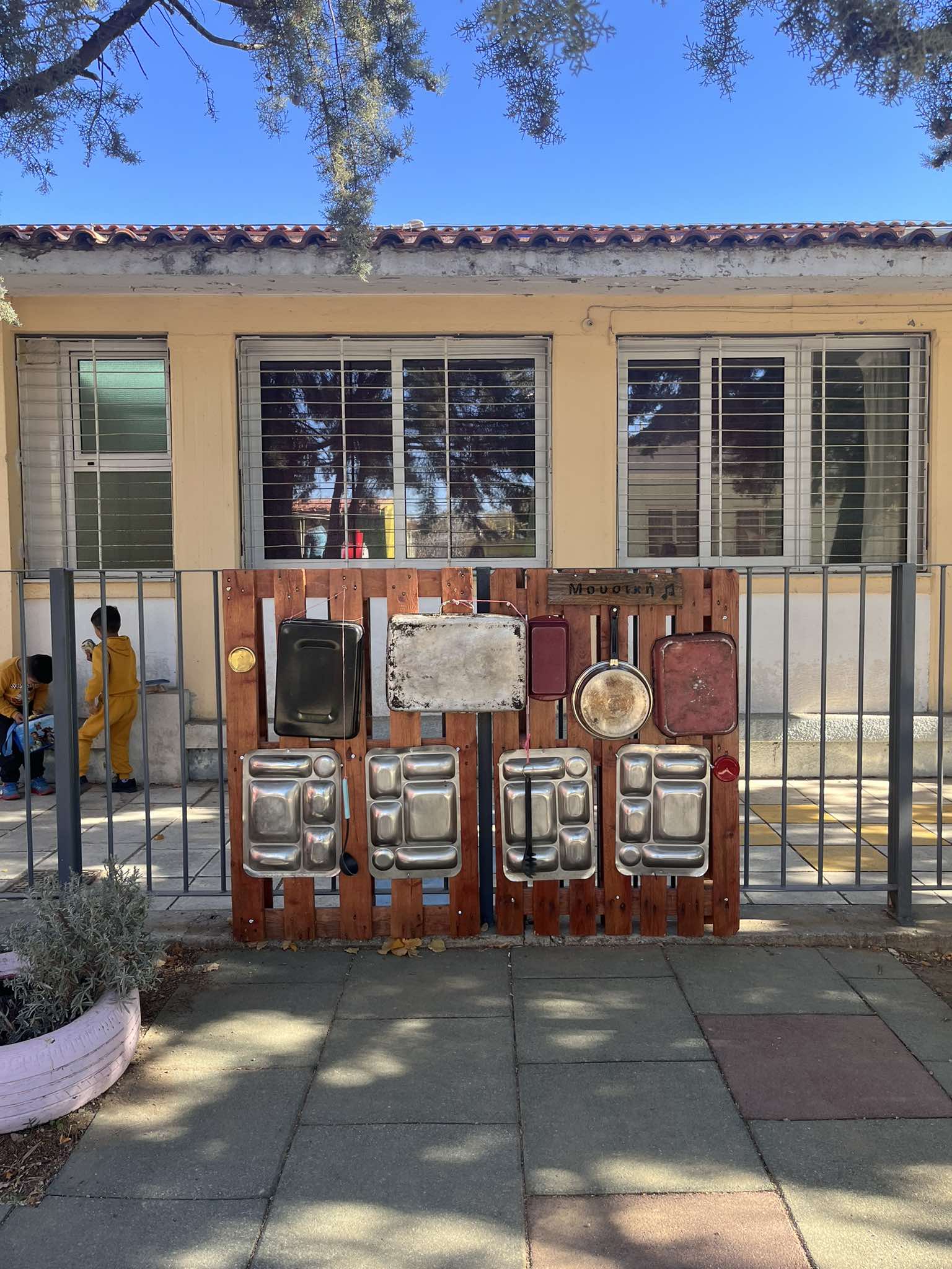 Η δημιουργία μιας γωνιάς μουσικής στην αυλή του νηπιαγωγείου μας είναι μια εξαιρετική ευκαιρία για να εμπλουτιστεί το παιχνίδι και να ενισχυθεί η δημιουργικότητα των παιδιών. Αυτή η γωνιά μπορεί να λειτουργήσει ως χώρος όπου τα παιδιά εξερευνούν ήχους, ρυθμούς και μουσικά όργανα μέσα από το ελεύθερο παιχνίδι και τη συνεργασία… Τα υλικά που χρησιμοποιήθηκαν είναι ξύλινες παλέτες, οικιακά σκεύη, καπάκια, κουτάλες, σύρμα και σχοινί.
