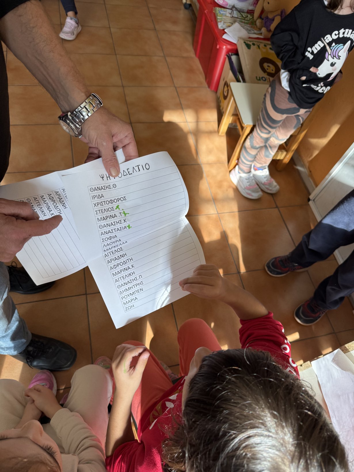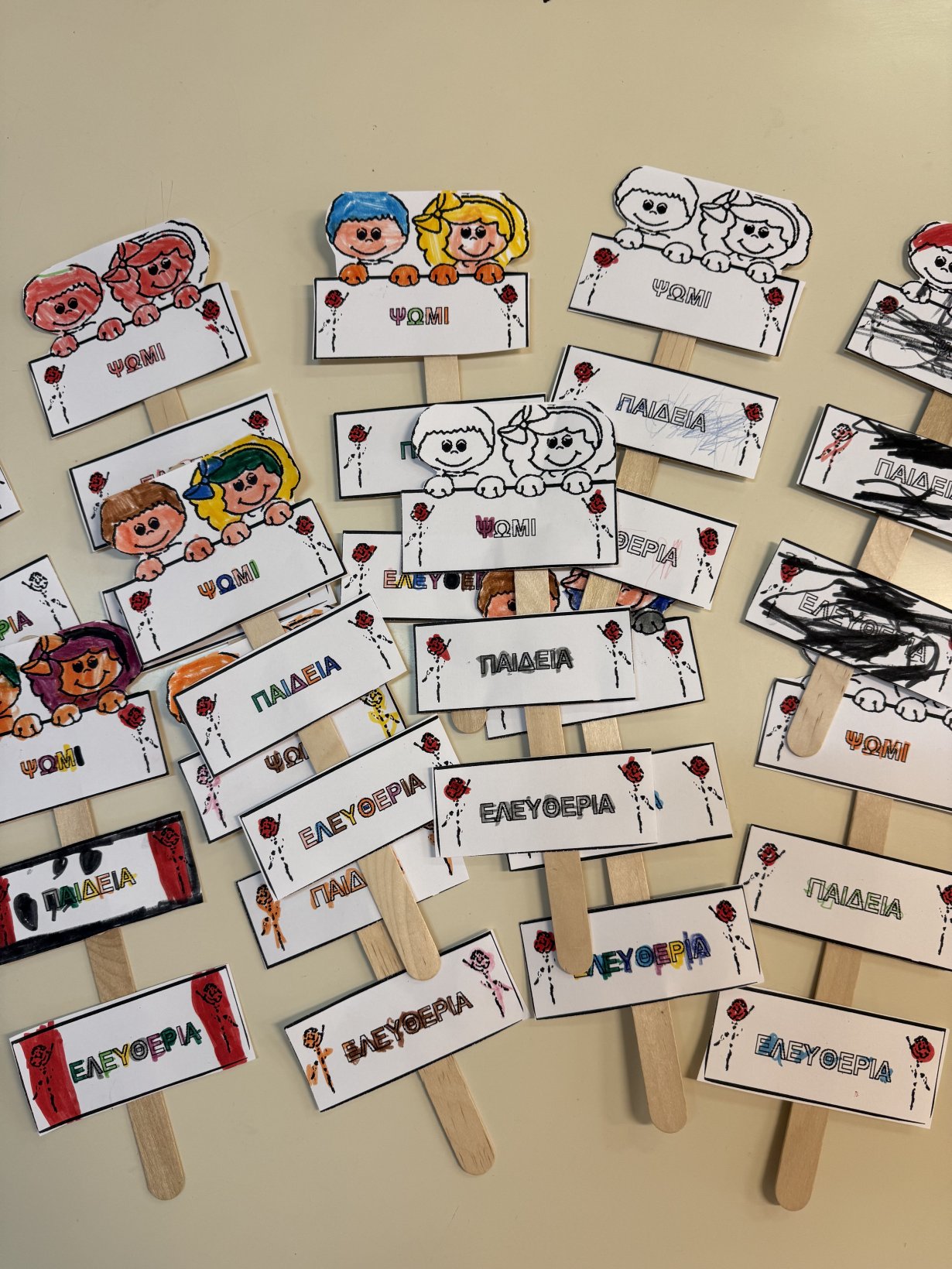 Τη σημαντική αυτή μέρα της 17 Νοέμβρη γιορτάσαμε στο νηπιαγωγείο μας, με κουκλοθέατρο, παιχνίδια και πολλές κατασκευές! Αναφερθήκαμε στα γεγονότα, τη σημαντικότητα της έννοιας της Δημοκρατίας, πόσο άσχημη είναι η Δικτατορία, μέσα από το αντίστοιχο παραμύθι και παίξαμε παιχνίδια. Και εκλογές κάναμε, με ψηφοδέλτια, κάλπη, εφορευτική επιτροπή, γραμματέα, με τα όλα τους δηλαδή, και βγάλαμε και αρχηγό! Ο κύριος Δήμος και ο κύριος Τυρρανάκης επισκέφτηκαν το σχολείο μας, που αυτό γέμισε συνθήματα και κατασκευές των παιδιών. Αφήσαμε και ένα γαρύφαλλο στην πύλη του Πολυτεχνείου!!! Ενώ τέλος, παίξαμε κουκλοθέατρο την “Τενεκεδούπολη”.