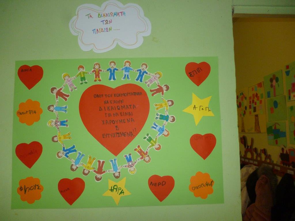Τίτλος: Στα χέρια μας τα ενωμένα, έχουμε τα δικαιώματά μας γραμμένα. Βασικοί στόχοι: Να γνωρίσουν τα δικαιώματα των παιδιών. Να αναπτύξουν στάσεις και δεξιότητες κοινωνικής ζωής, να υιοθετήσουν αξίες και πρότυπα σεβασμού και συνεργασίας. Να κατανοήσουν ότι είμαστε διαφορετικοί, αλλά μπορούμε όλοι να απολαμβάνουμε τα ίδια δικαιώματα, για μια αρμονική συμβίωση. |