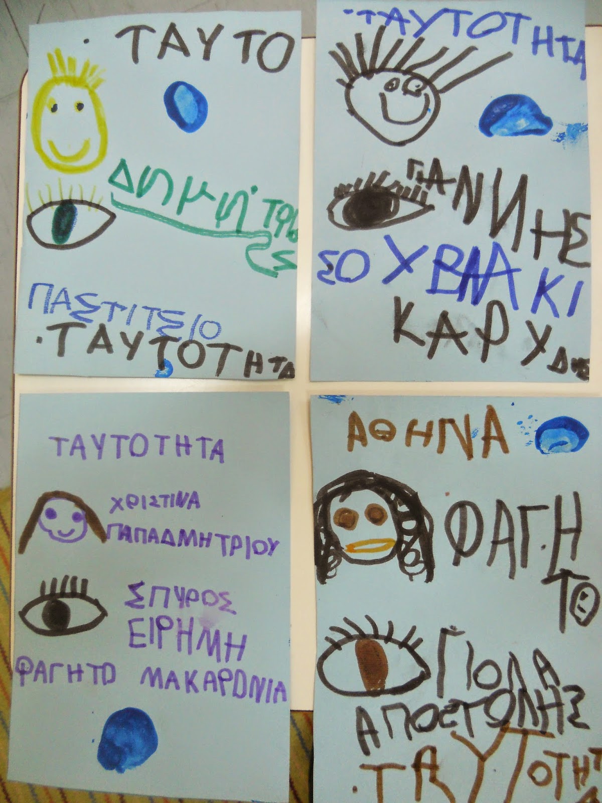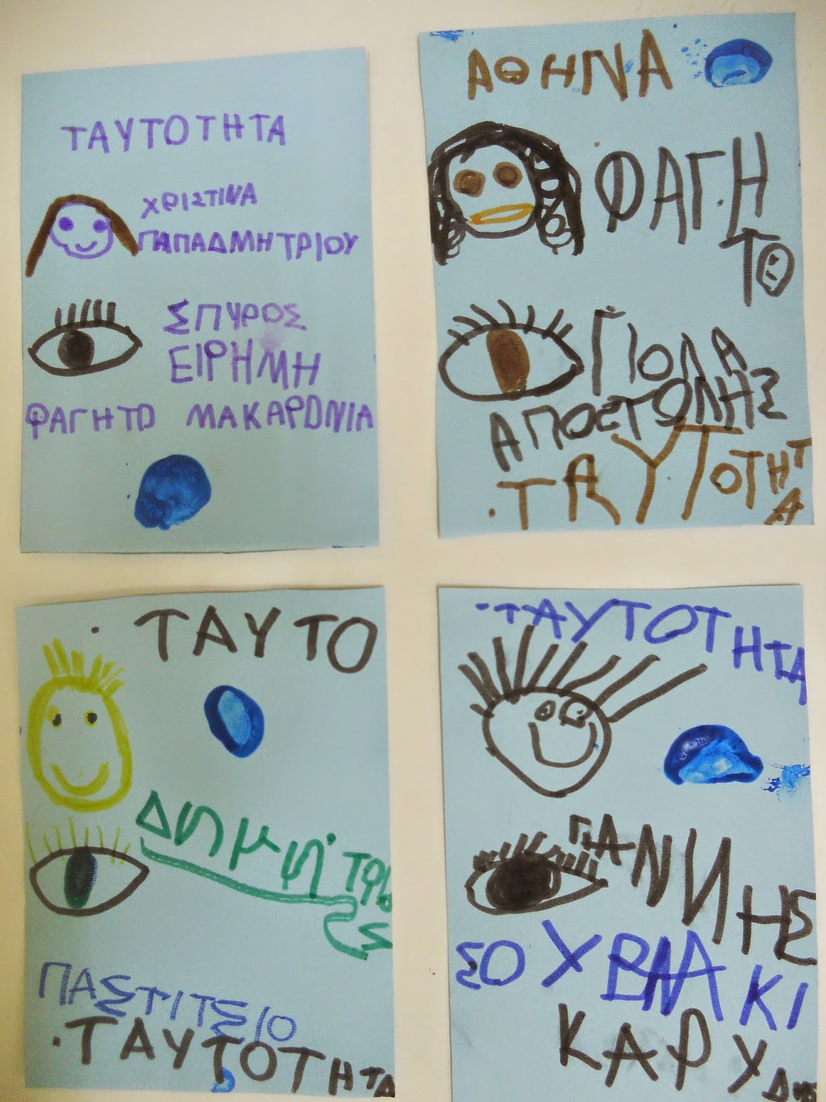 Στο πλαίσιο του προγράμματος “Διαφορετικότητα-ρατσισμός”τα παιδιά αφού κατανοήσουν την χρησιμότητα της ταυτότητας για όλους συμπηρώνουν την ταυτότητα τους με τα στοιχεία και το δακτυλικό τους αποτύπωμα.