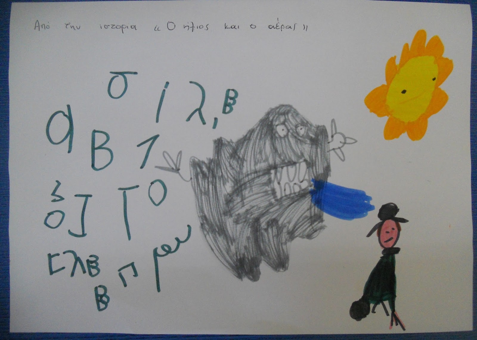 Όταν φυσά δυνατά πέφτουν τα φύλλα από τα δέντρα και στρώνεται παντού ένα πολύχρωμο χαλί κι οι μαμάδες τρέχουν στις αυλές και τα μπαλκόνια για να τα σκουπίσουν . Επίσης τα δέντρα λυγίζουν και κάποιες φορές ξεριζώνονται . Κι όταν φυσά η φωτιά δυστυχώς εξαπλώνεται περισσότερο κι όλοι ελπίζουν να κοπάσει ο αέρας για να μην καταστραφεί το δάσος από την πυρκαγιά