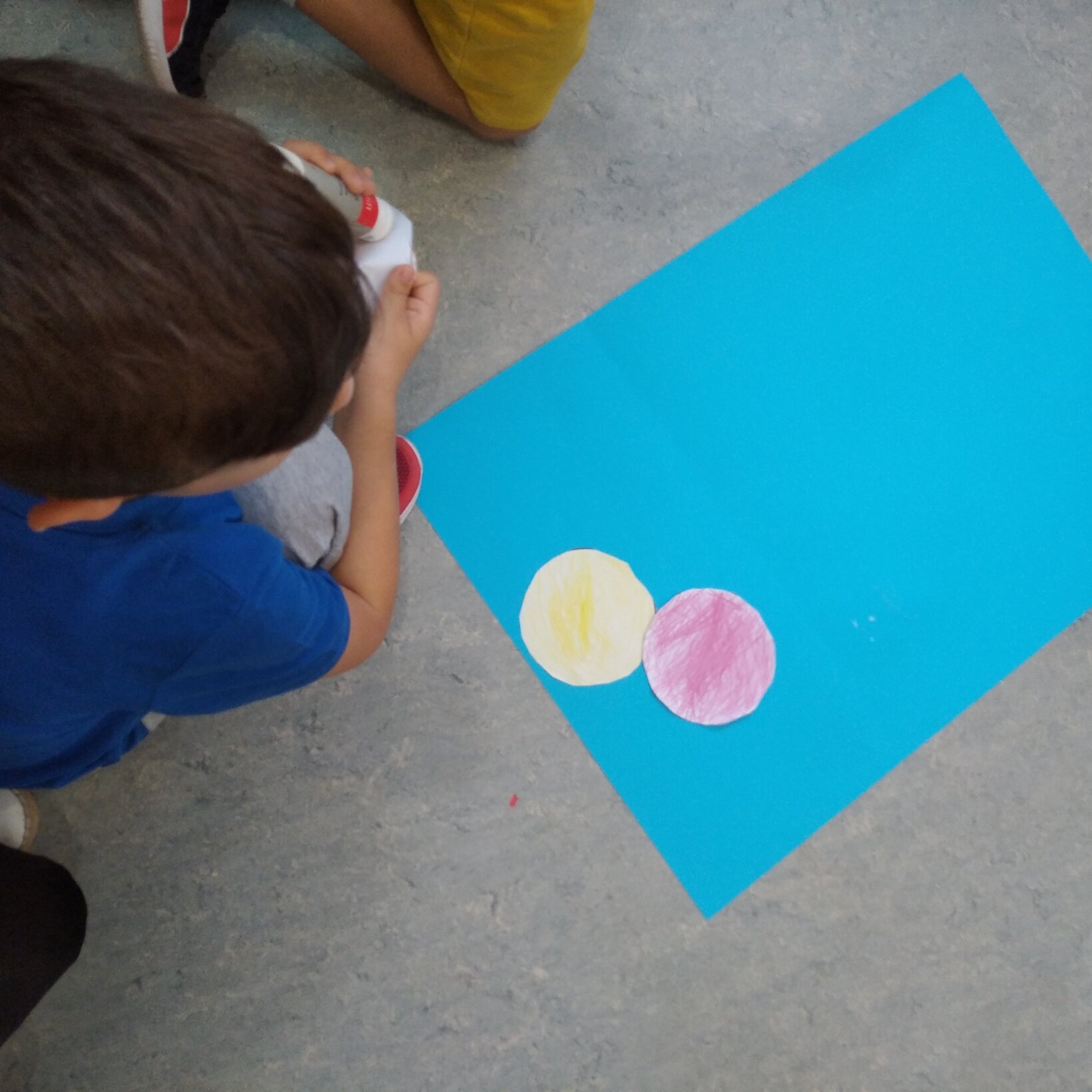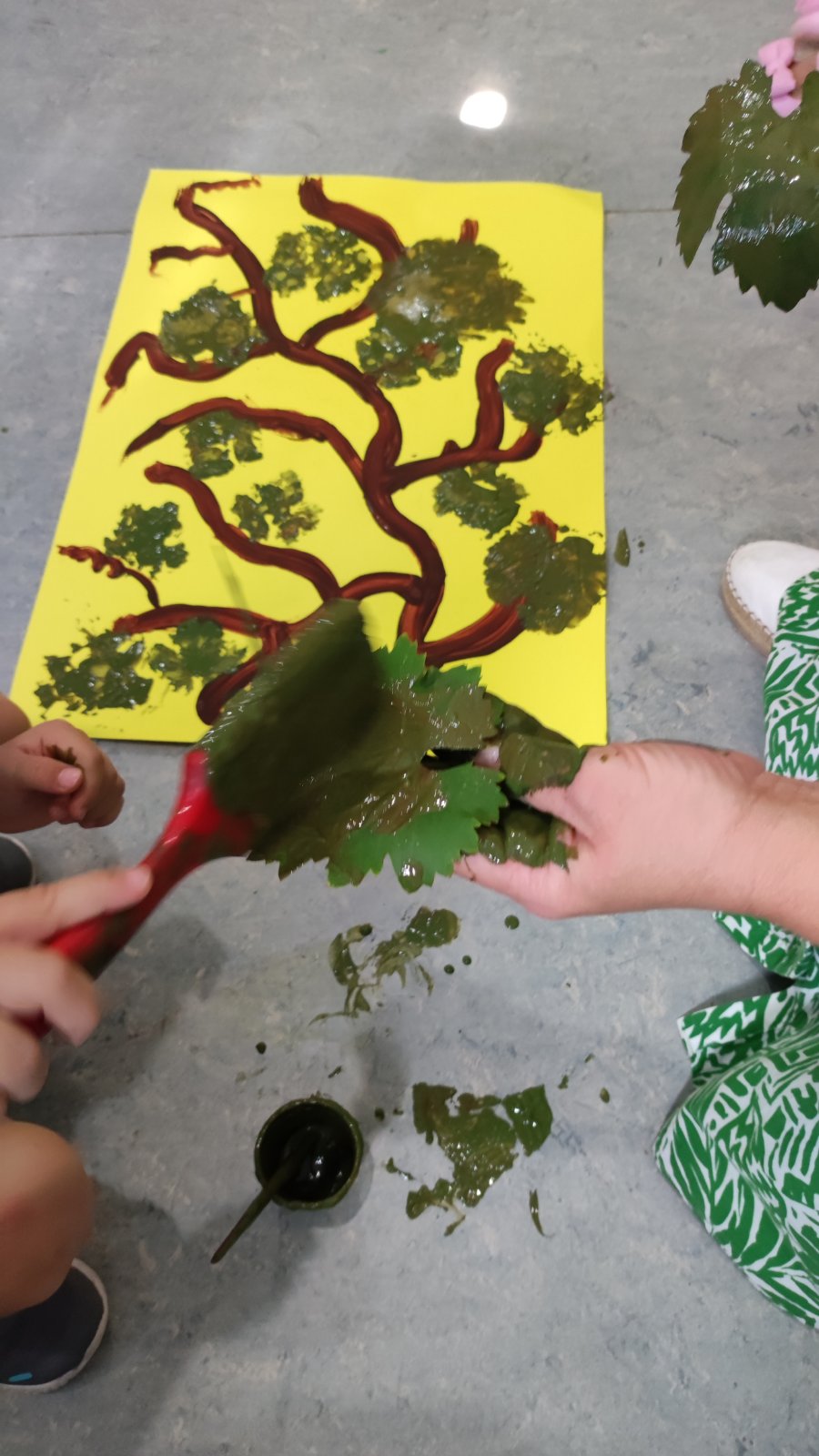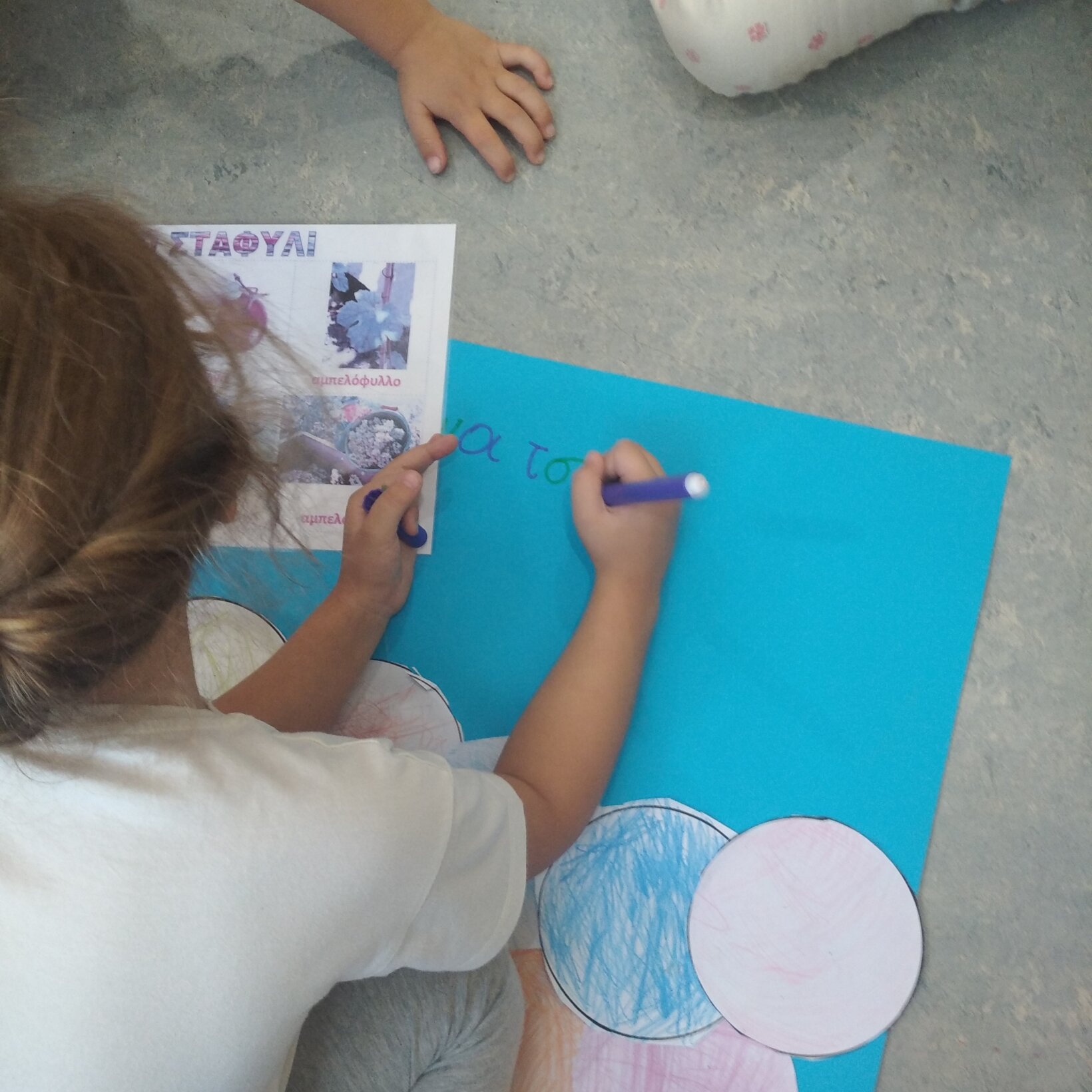 Τα παιδιά έπρεπε να συνεργαστούν και με τα χέρια κολλημένα μεταξύ τους κλήθηκαν να ζωγραφίσουν! Το τεράστιο σταφύλι που έφτιαξαν στόλισε την τάξη μας!