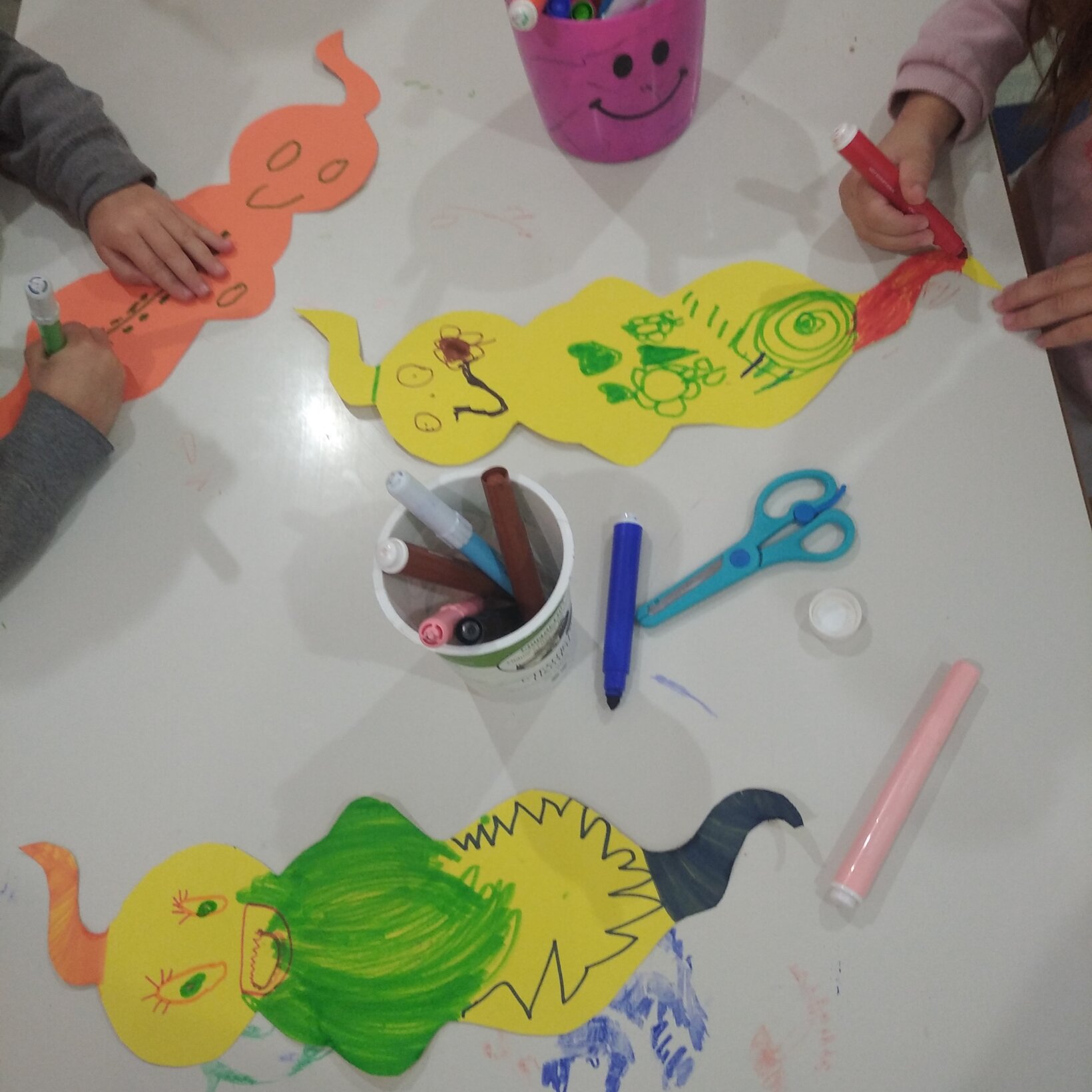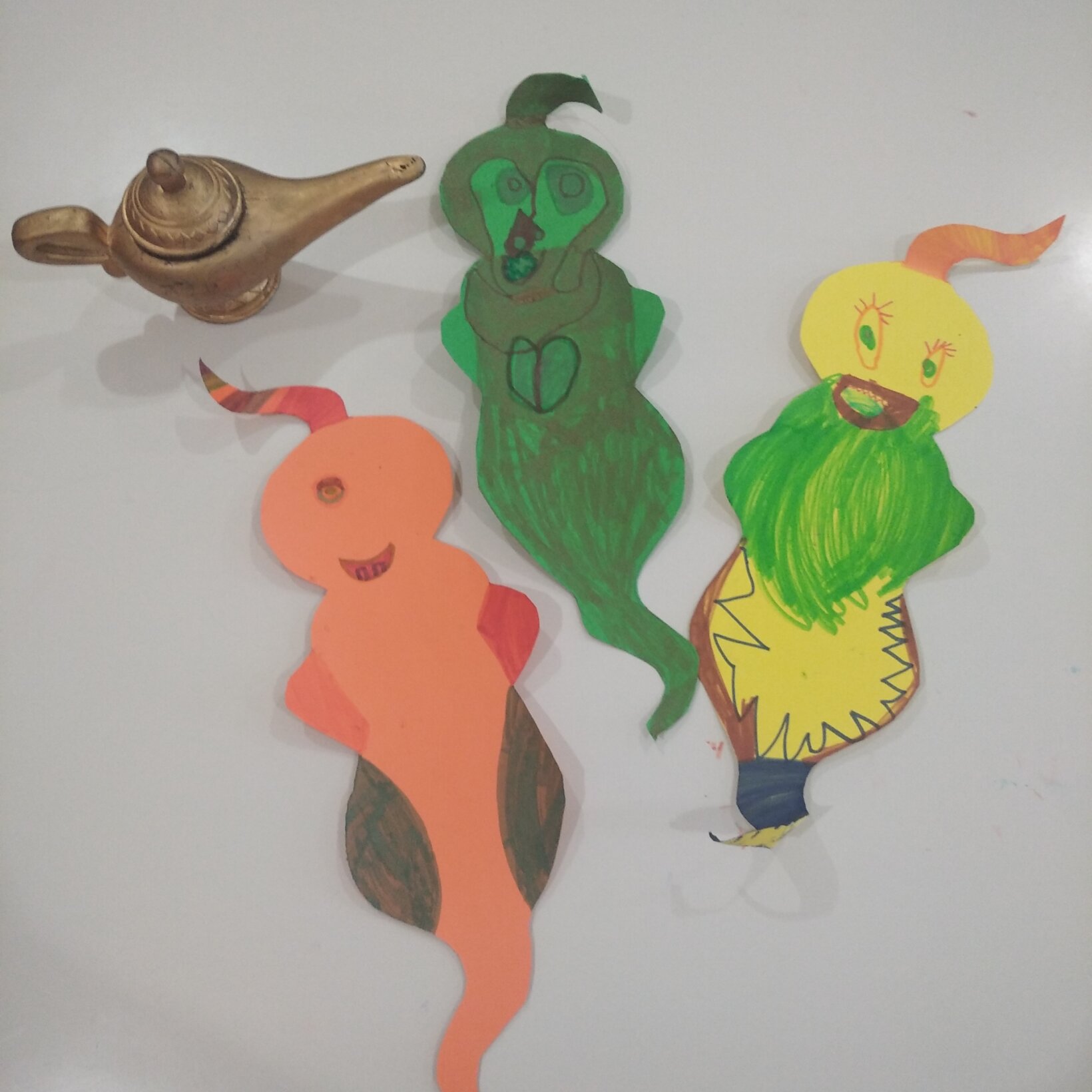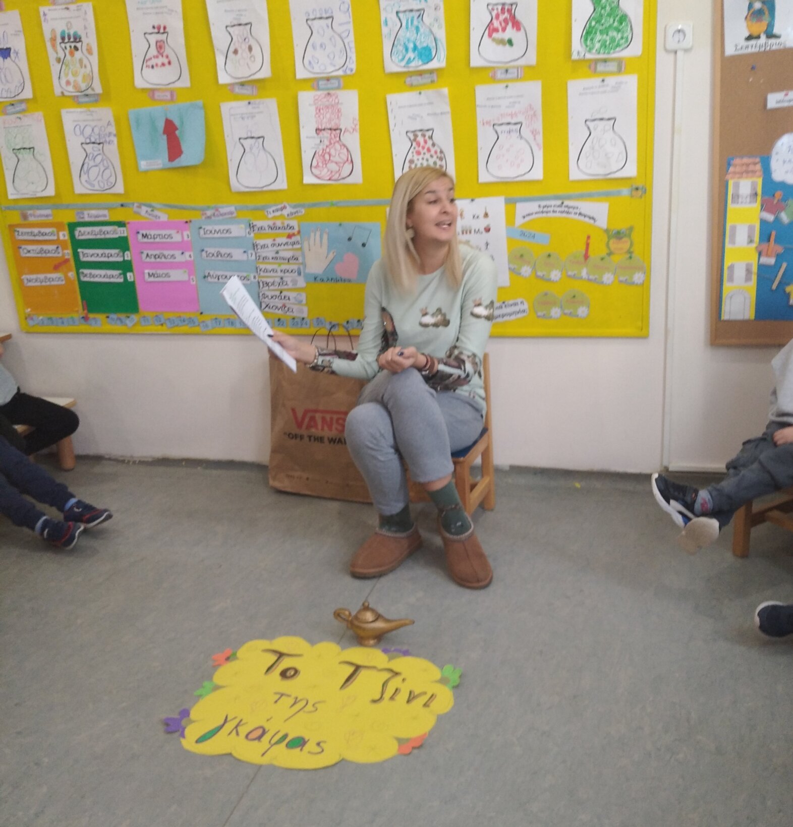 Μας διάβασε το παραμύθι της, συζητήσαμε, προβληματιστήκαμε, ζωγραφίσαμε τα τζίνι που μας χάρισε , εικονογραφήσαμε την ιστορία και στο τέλος σκεφτήκαμε τι θα ζητούσαμε και εμείς, αν βρίσκαμε ένα λυχνάρι με ένα τζίνι που πραγματοποιεί ευχές!