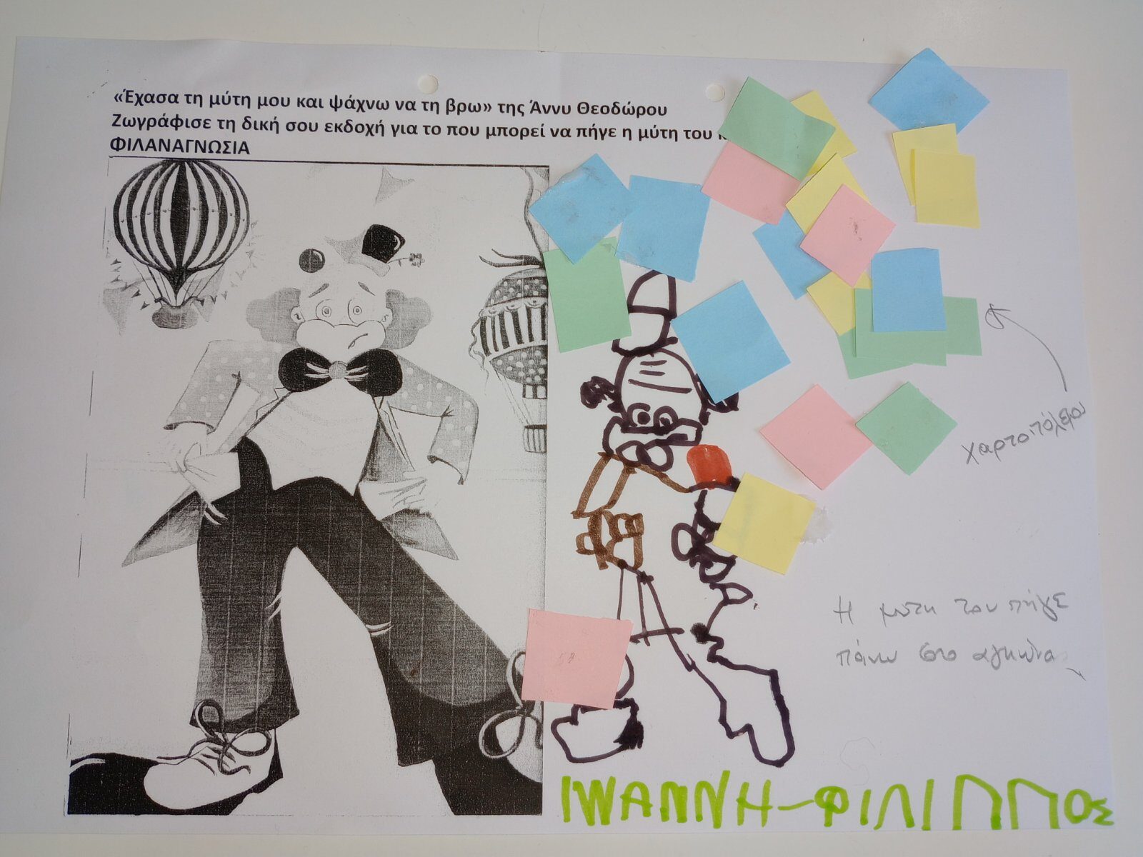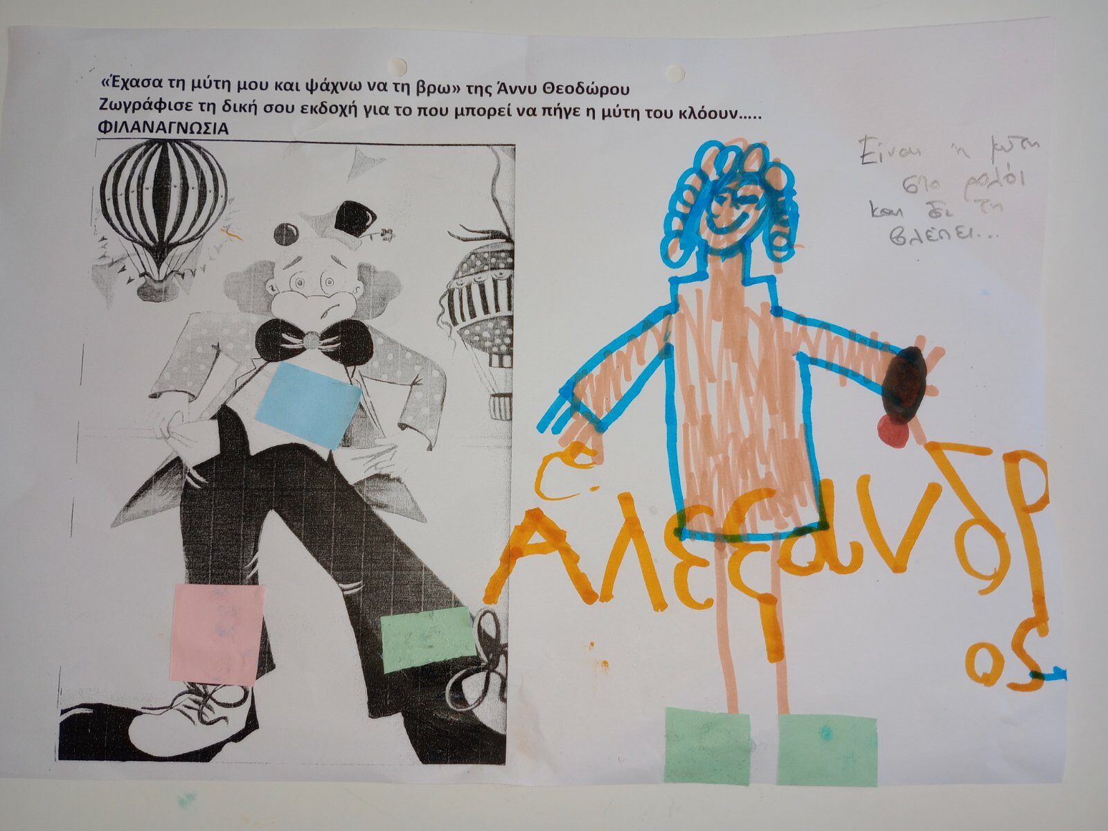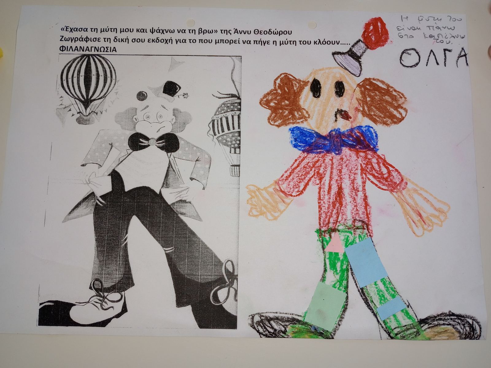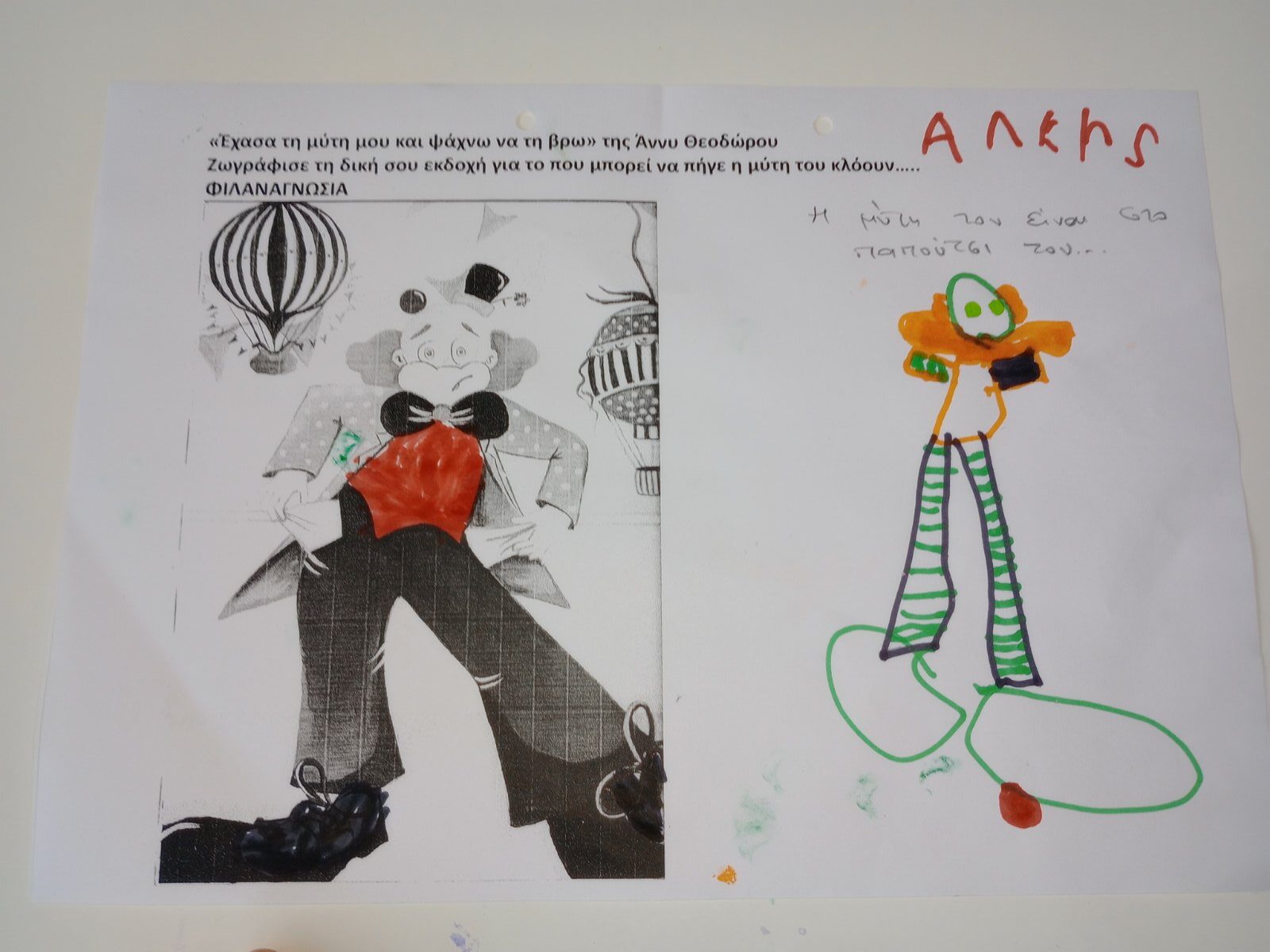 Φιλαναγνωσία “Έχασα τη μύτη μου και ψάχνω να τη βρω” της Άννη Θεοχάρη . Με αφορμή το παραπάνω βιβλίο,που επεξεργαστήκαμε στα πλαίσια του Σχεδίου Δράσης της Φιλαναγνωσίας παρακάτω παρουσιάζεται φύλλο εργασίας και παιχνίδι με ζευγάρια, το ένα παιδί έχει κλειστά τα μάτια του και το άλλο προσπαθεί να το καθοδηγήσει ώστε να τοποθετήσει τη μύτη του κλόουν στο σωστό σημείο του προσώπου του.