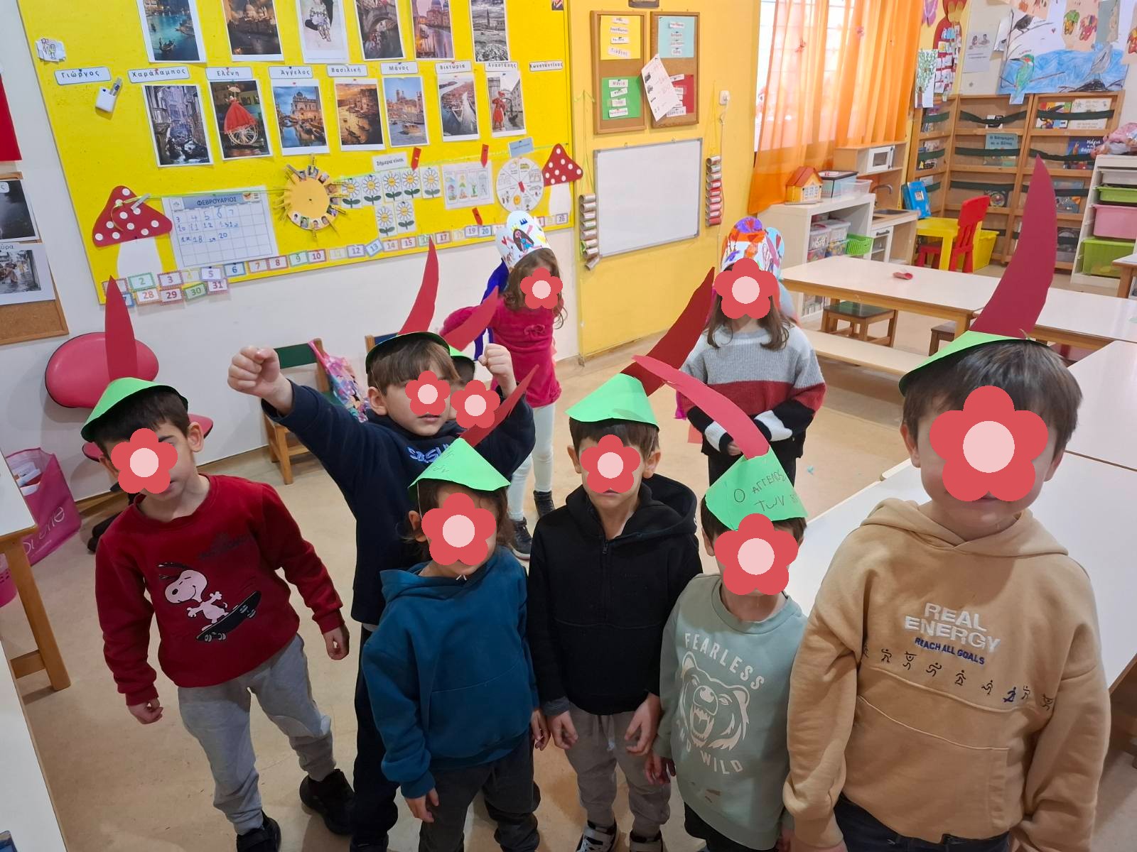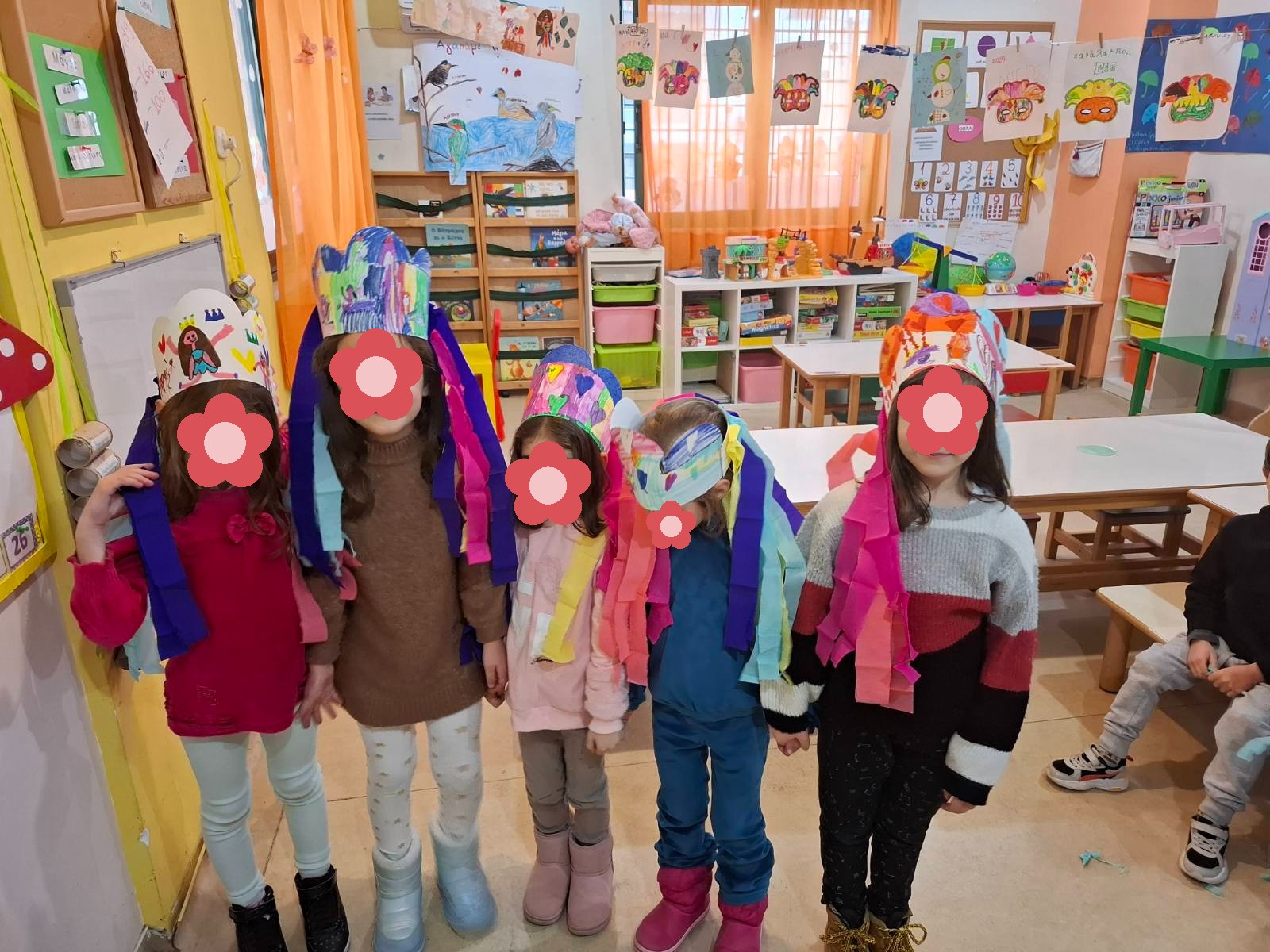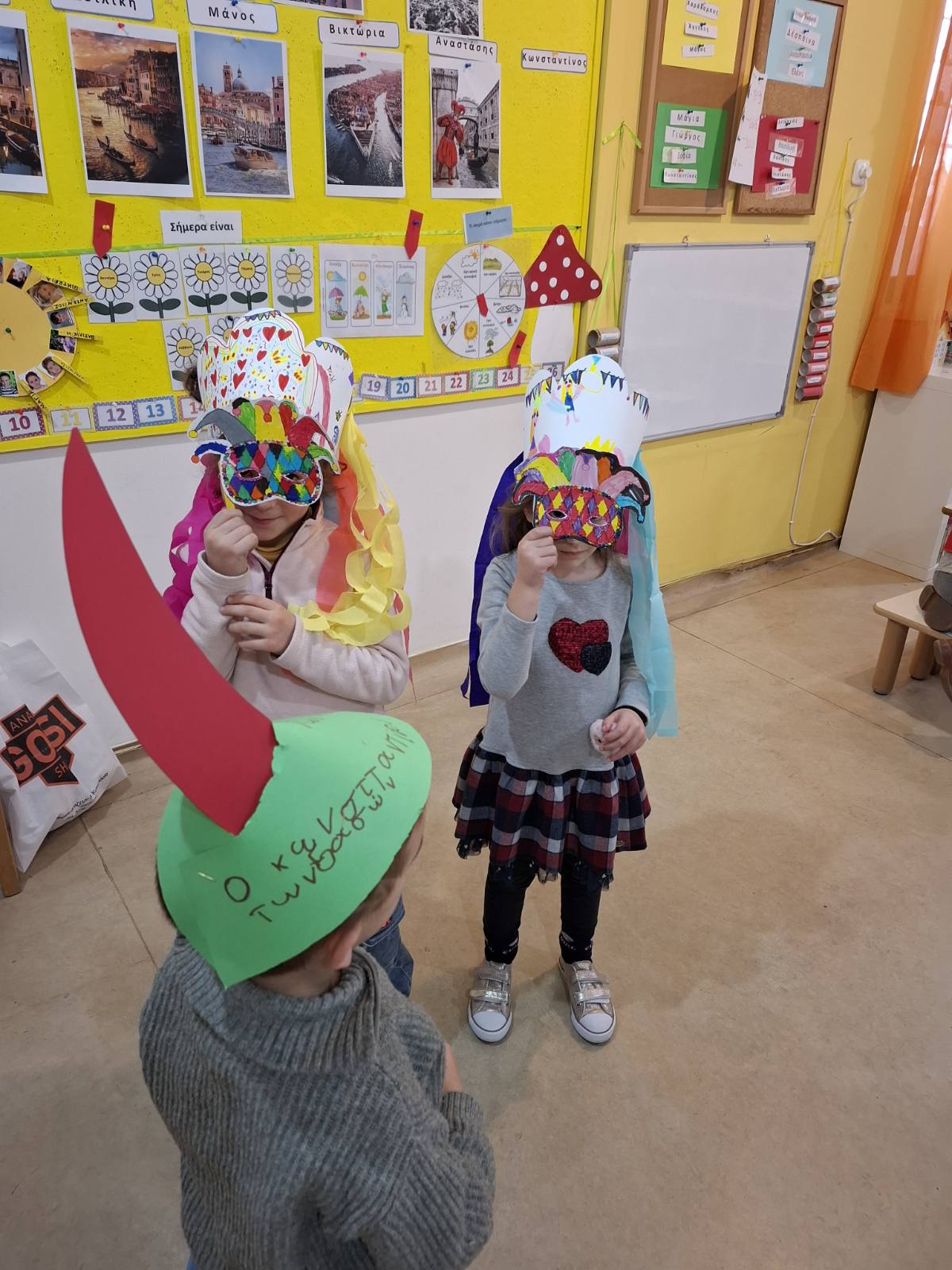 Χρώματα, χαρτόνια, ψαλίδια, χρυσόσκονες και μπόλικη φαντασία ήταν τα απαραίτητα συστατικά για να δημιουργήσουμε τις μάσκες, τα καπέλα μας, τις χειροτεχνίες μας.