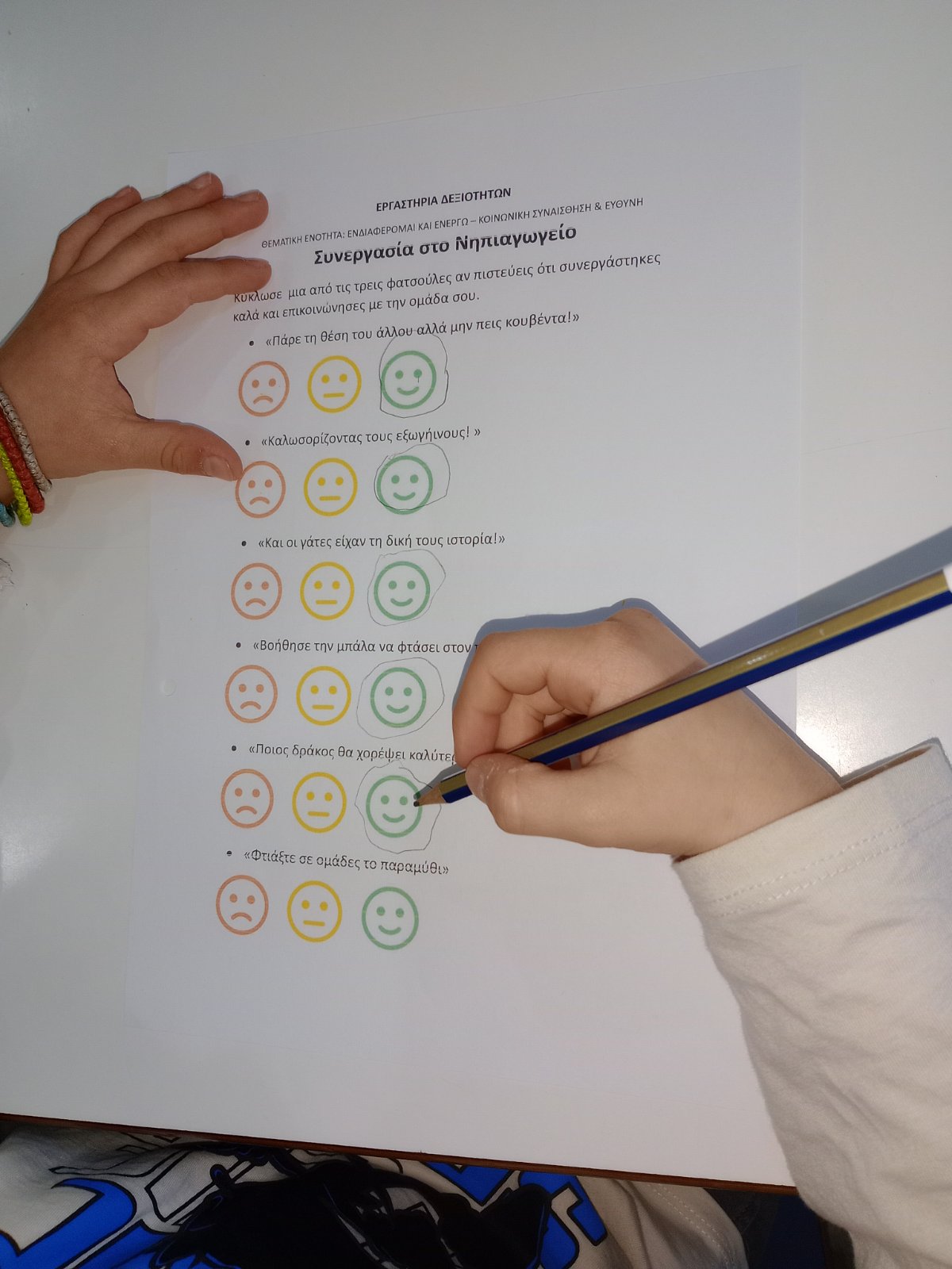 Ως προς τις δεξιότητες επιδιώξαμε να καλλιεργηθούν οι εξής: Αυτομέριμνα , αυτορρύθμιση, υπευθυνότητα, αλληλεγγύη, πρωτοβουλία, συνεργασία κοινωνικές δεξιότητες, κριτική σκέψη, επίλυση προβλημάτων. Η προσέγγιση της θεματικής ήταν κατά κύριο λόγο διαθεματική με προσπάθεια να εμπλακούν σε αυτή όλα τα γνωστικά αντικείμενα του Νηπιαγωγείου.