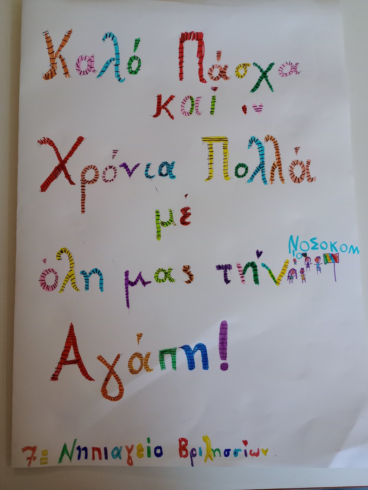 Τέλος, γράψαμε τη λέξη “Πρωτομαγιά” και ζωγραφίσαμε λουλούδια, χαρούμενα πρόσωπα και φύση που οργιάζει…