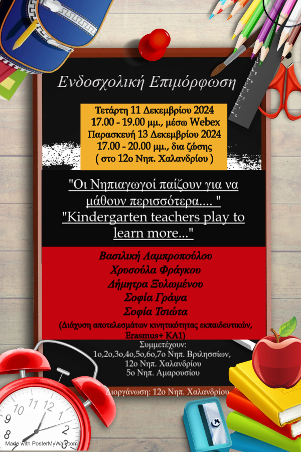 - “Βιβλιοθήκη στο Νηπιαγωγείο : Από τη θεωρία στην πράξη” (11/12/24) στο πλαίσιο των επιμορφωτικών δράσεων της Συμβούλου