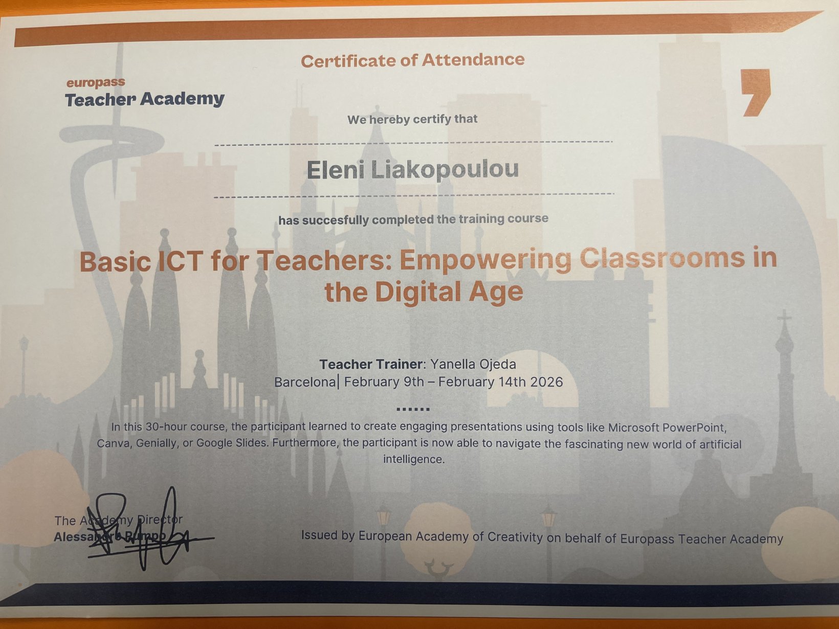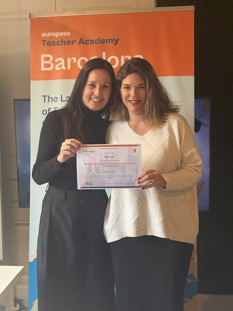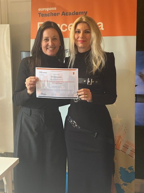 Τον Φεβρουάριο του 2026, η καθηγήτρια Αγγλικών κ.Λιακοπούλου Ελένη και η δασκάλα του Β1 τμήματος κ.Φιτσάλη Ελένη συμμετείχαν στο πρόγραμμα Erasmus στη Βαρκελώνη, με θέμα τη χρήση εργαλείων Τεχνητής Νοημοσύνης στη διδασκαλία. Εκπροσώπησαν με επιτυχία το σχολείο μας ανάμεσα σε συναδέλφους από πολλές ευρωπαϊκές χώρες, ανταλλάσσοντας ιδέες και καλές πρακτικές. Η συμμετοχή αυτή αποτελεί απόδειξη της διαρκούς προσπάθειας για εκπαιδευτική ανανέωση και ευρωπαϊκή συνεργασία. Σύντομα, άλλοι συνάδελφοί θα συνεχίσουν αυτή την προσπάθεια με αποστολές στη Φλωρεντία και το Παρίσι!