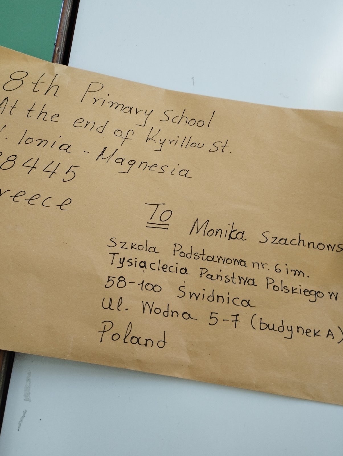 Τέλος, εξοικειώθηκαν με τη διαδικασία αποστολής αλληλογραφίας. Τα παιδιά παρατήρησαν στον φάκελο τη διεύθυνση του αποστολέα και του παραλήπτη, κατανοώντας τη σημασία σωστής συμπλήρωσης των στοιχείων. Η χαρά τους ήταν μεγάλη όταν παρέλαβαν και τις δικές τους κάρτες από τους Πολωνούς μαθητές.