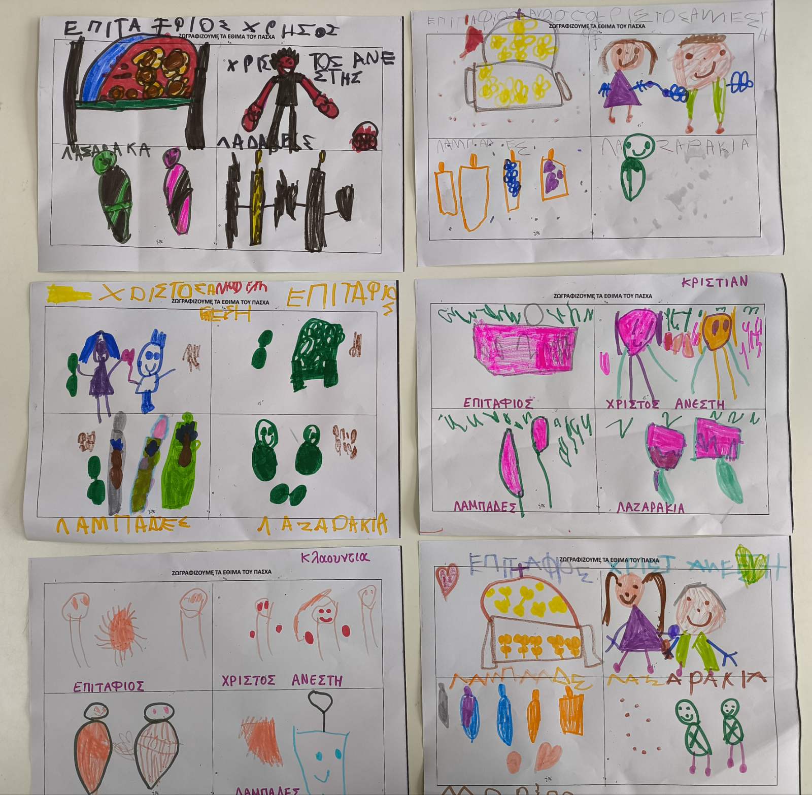 Είδαμε εκπαιδευτικά βίντεο για τα έθιμα του Πάσχα , συζητήσαμε για τις εμπειρίες μας και έπειτα τα ζωγραφίσαμε και γράψαμε τις λέξεις ( λαζαράκια, επιτάφιος, λαμπάδες, Χριστός Ανέστη ) κάνοντας λειτουργική αντιγραφή.