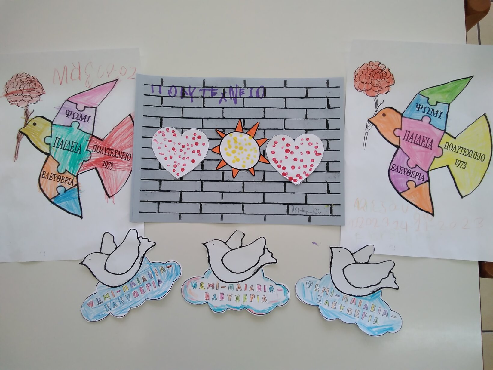 Με αφορμή την επέτειο του Πολυτεχνείου συζητήσαμε τα γεγονότα της 17ης Νοέμβρη του 1973, είδαμε φωτογραφικό υλικό και βίντεο και ακούσαμε τραγούδια. Προσπαθήσαμε να κατανοήσουμε την έννοια της Δημοκρατίας σε αντίθεση με την έννοια της Δικτατορίας. Διαβάσαμε παραμύθια που περιγράφουν τις δυο έννοιες όπως το παραμύθι “Η κυρά Δημοκρατία” της Αρμενιάκου. Μάθαμε το τραγούδι ” Τα παιδιά ζωγραφίζουν στον τοίχο” και το δραματοποιήσαμε.