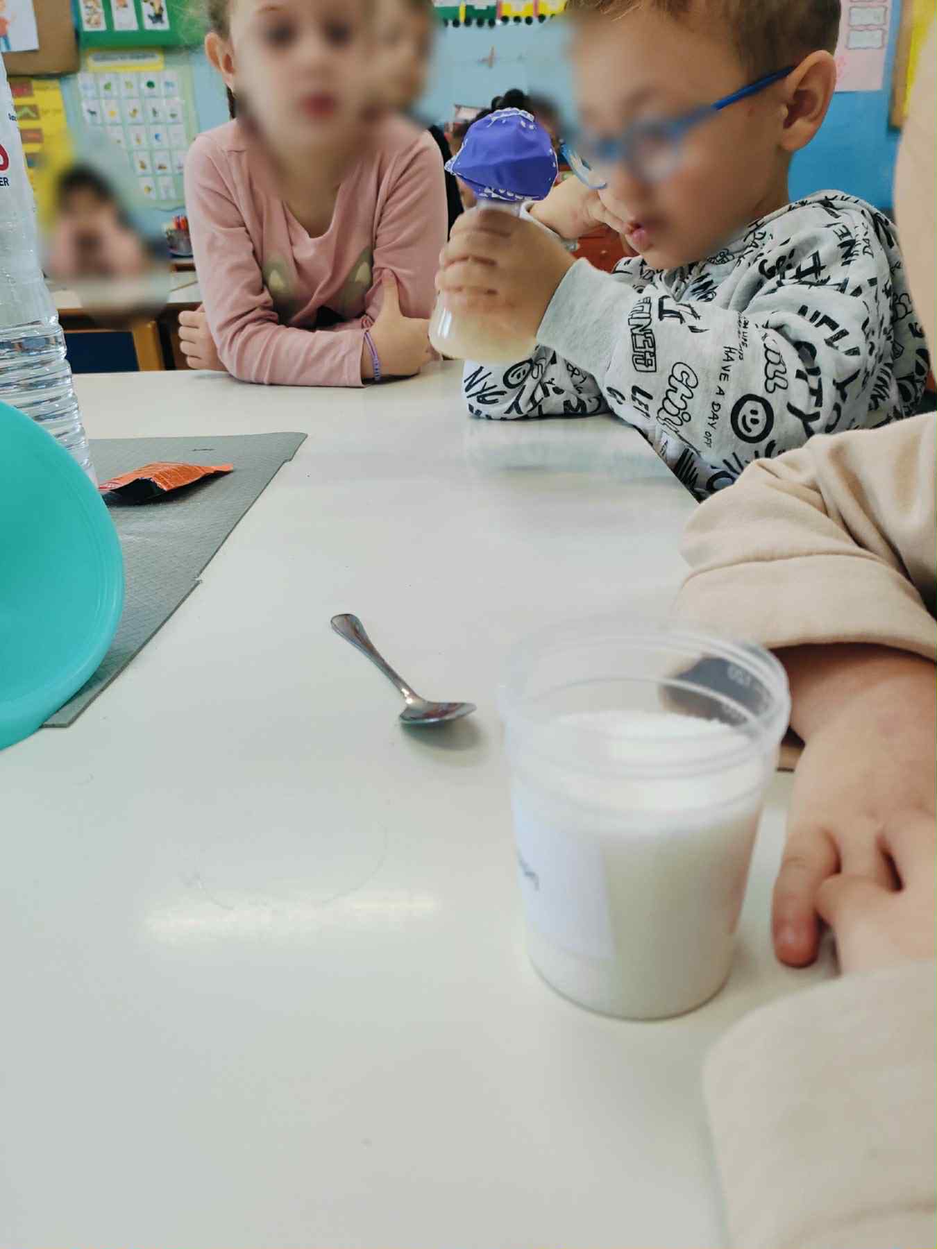 Την Δευτέρα 24/11 και την Τρίτη 25/11 η κ. Μαρία Σπανάκη μας επισκέφτηκε στο χώρο του σχολείου μας, ώστε να γίνουμε μικροί επιστήμονες και να υλοποιήσουμε φυσικά πειράματα. Τα πειράματα αυτά αφορούσαν την διατροφή αλλά και καιρικά φαινόμενα. Ξεκινήσαμε μέσω του πειράματος της επιρροής της ζαχάρης, κατά το οποίο οι μαθητές, τοποθετώντας μαγιά και ζάχαρη, μπόρεσαν να παρατηρήσουν τι γίνεται στο στομάχι μας όταν την καταναλώνουμε. Έπειτα, συνεχίσαμε με την κατανόηση υγιής και μη υγιής τροφής αλλά και πως επηρρεάζει το στομάχι μας. Οι μαθητές, έβαζαν σε βάζο με νερό διάφορα φρούτα, λαχανικά (υγιεινά τρόφιμα) και κρουασάν-μπισκότα (ανθυγιεινά τρόφιμα), με σκοπό να παρατηρήσουν αν βυθίζονται (είναι εύπεπτα) ή αν επιπλέουν (δύσπεπτα). Συνεχίσαμε με την κατανόηση δημιουργίας ουράνιου τόξου και καταφέραμε να το δημιουργήσουμε στις τάξεις μας. Τέλος ολοκληρώσαμε με την δημιουργία βροχής αλλά και συννεφιάς όπου τα παιδιά μαγεύτηκαν. Ευχαριστούμε πολύ, την κ. Σπανάκη και την βοηθό της κ. Κυριακή. (υλικό από όλα τα τμήματα)