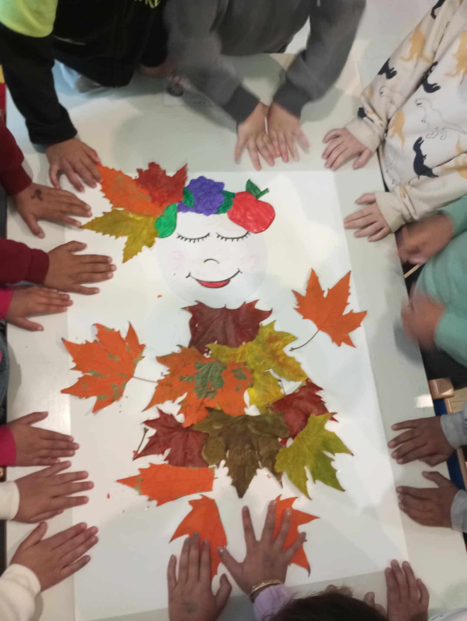 5)Δημιουργούμε πίνακες ζωγραφικής αλλά και κατασκευές-ατομικές και ομαδικές, με φθινοπωρινά φύλλα, τυπώματα και διάφορες τεχνικές ζωγραφικής(τύπωμα με φελλό, τύπωμα με φύλλα, κ.α.)