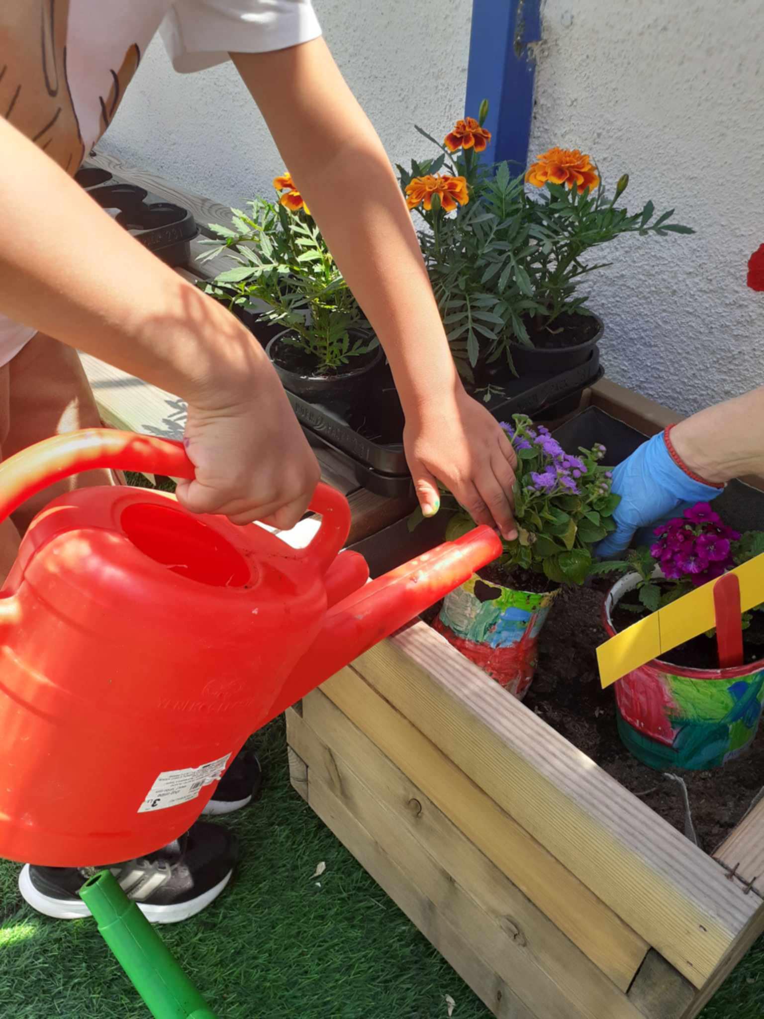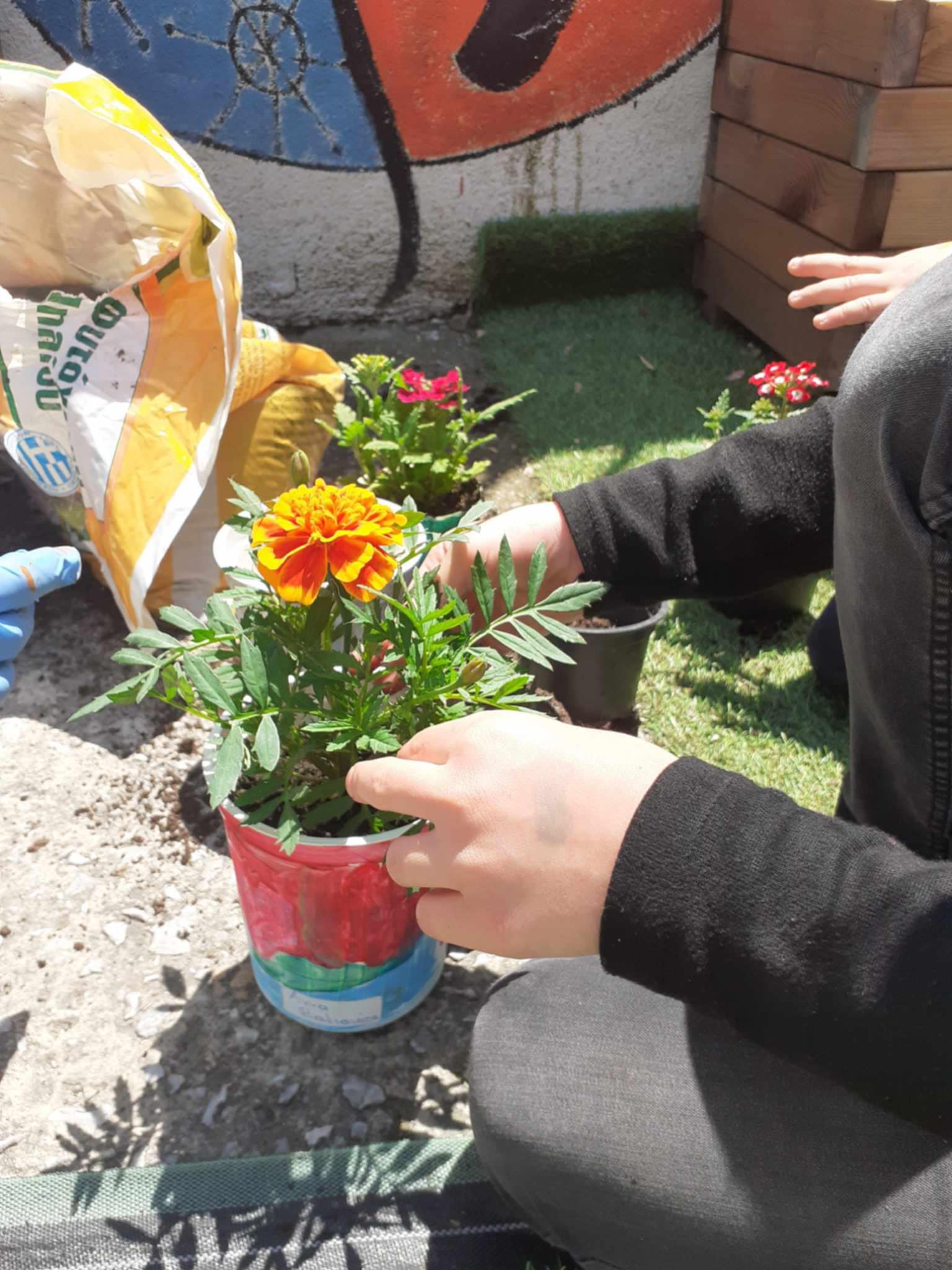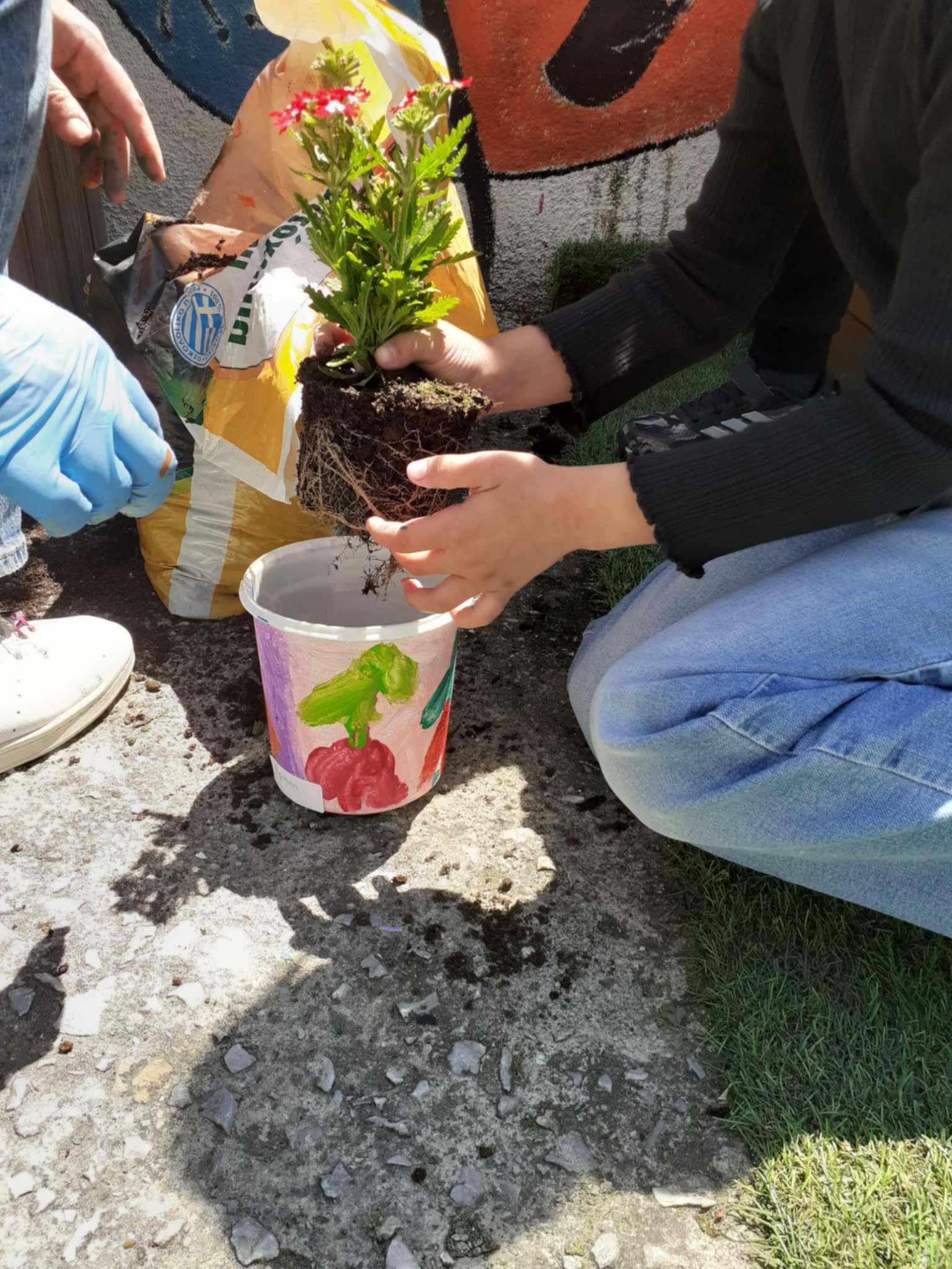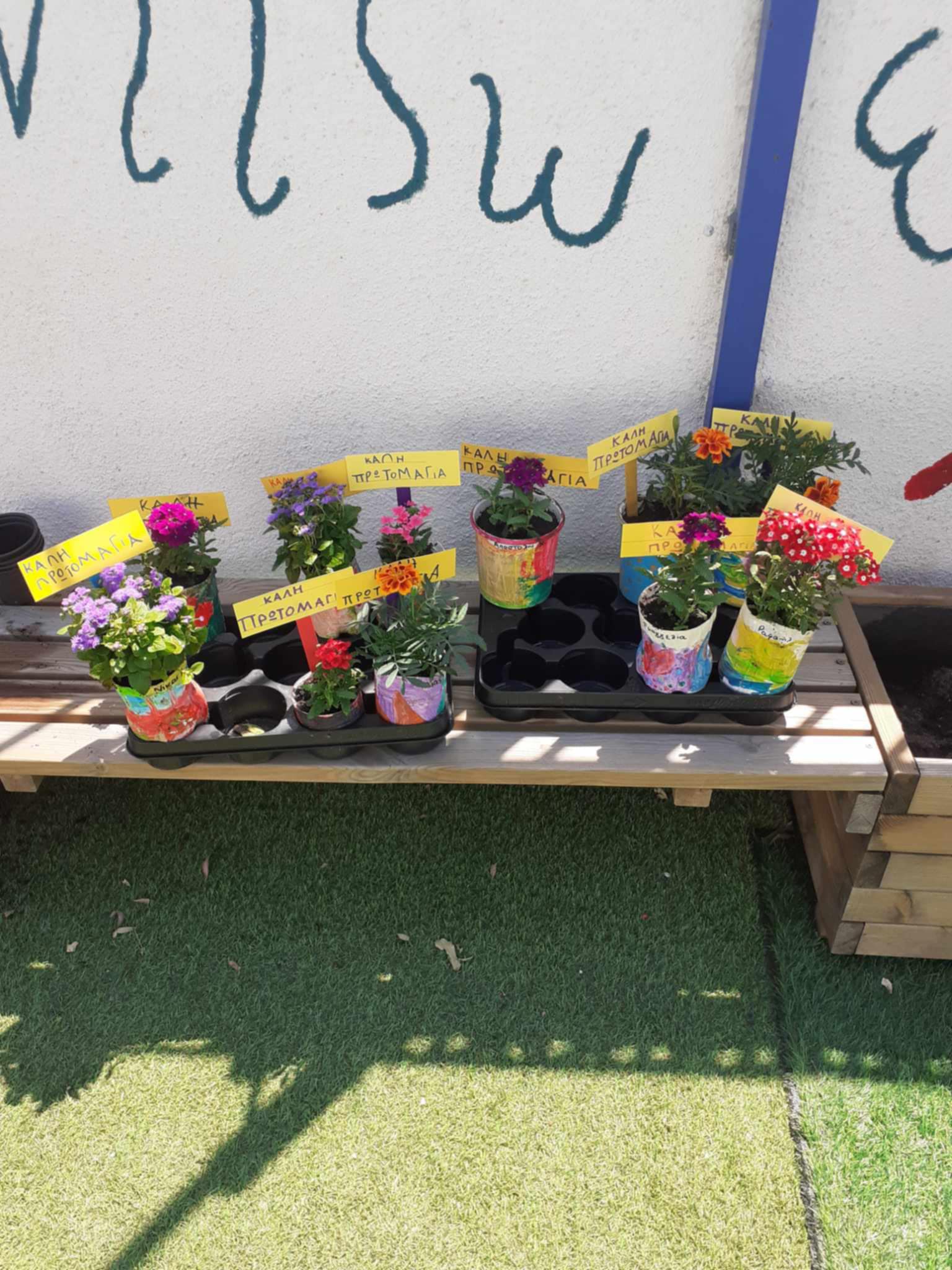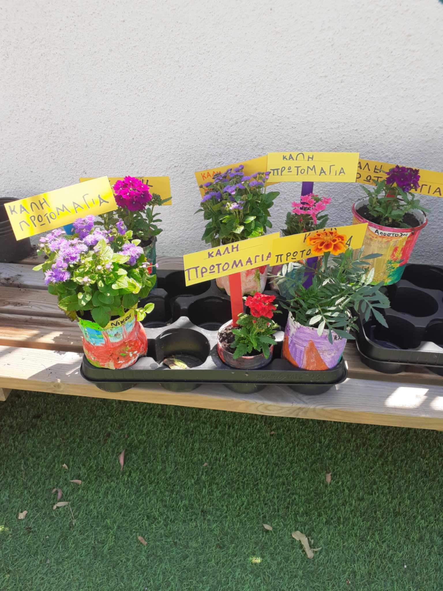 Φυσικά οι δημιουργίες μας δεν σταμάτησαν εκεί..Τα παιδιά έβαψαν και διακόσμησαν κεσεδάκια γιαουρτιού και μπουκάλια, τα οποία χρησιμοποιήθηκαν σαν γλαστράκια, όπου οι μικροί μαθητές φύτεψαν τα δικά τους λουλούδια και πήραν ως δώρο Πρωτομαγιάς, στο σπίτι τους!