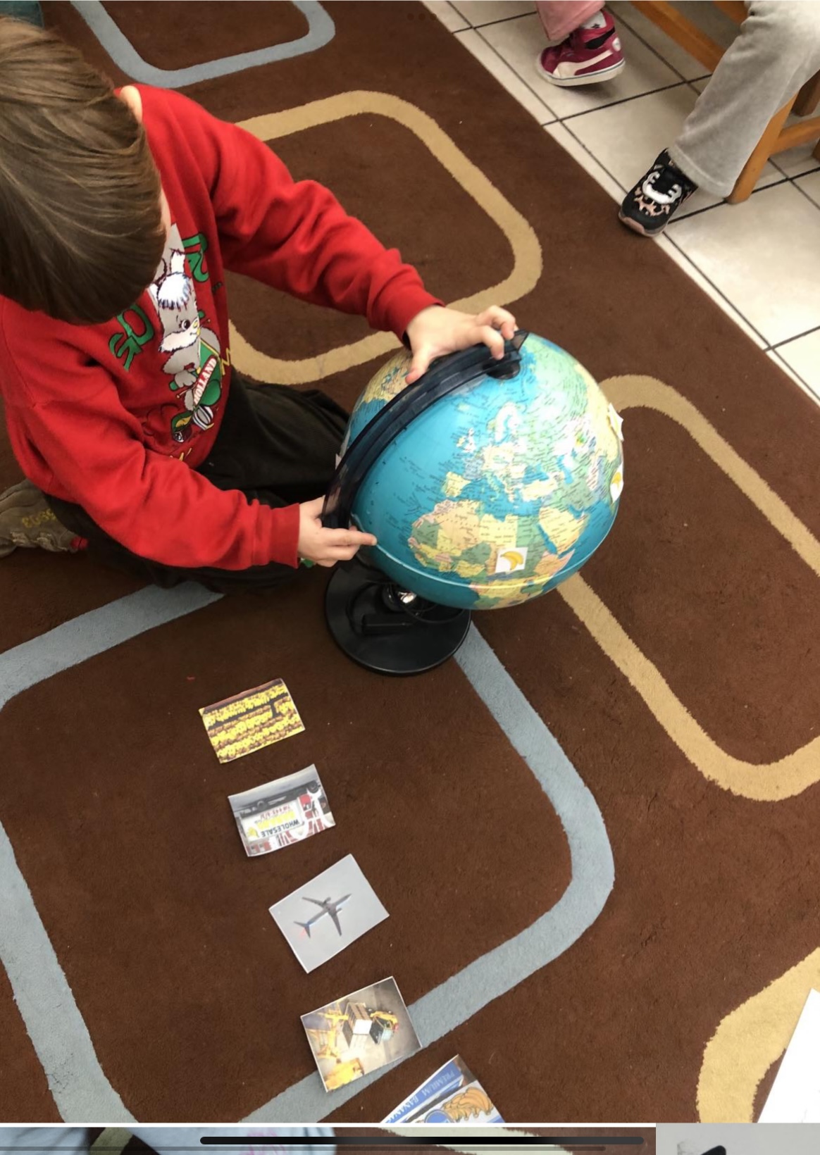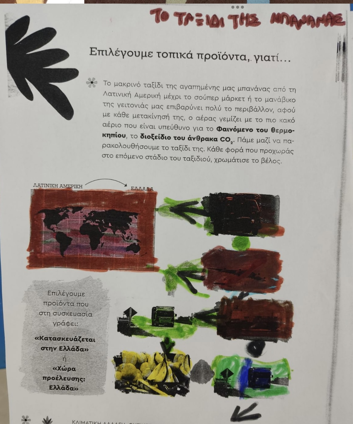 Σήμερα συζητήσαμε και ανακαλύψαμε το ταξίδι ενός από τα αγαπημένα μας φρούτα, της μπανάνας. Προέρχεται από την Ελλάδα ή από χώρες μακρινές; Πόσο μεγάλο ταξίδι κάνει μέχρι να φτάσει στο σούπερ μάρκετ; Με τη βοήθεια της υδρογείου σφαίρας, του εποπτικού και οικοδομικού υλικού, καταλάβαμε το μεγάλο ταξίδι της μπανάνας.