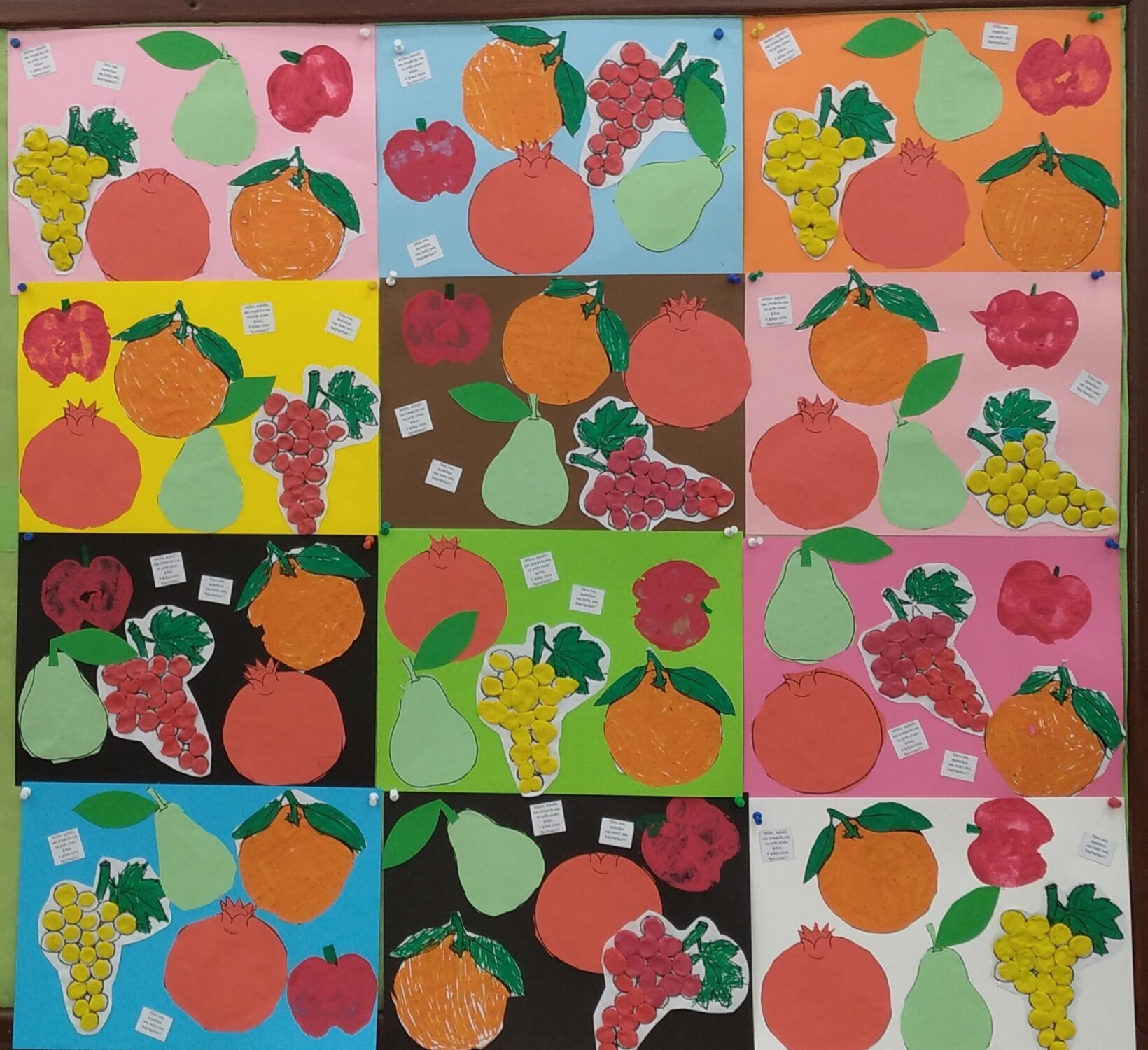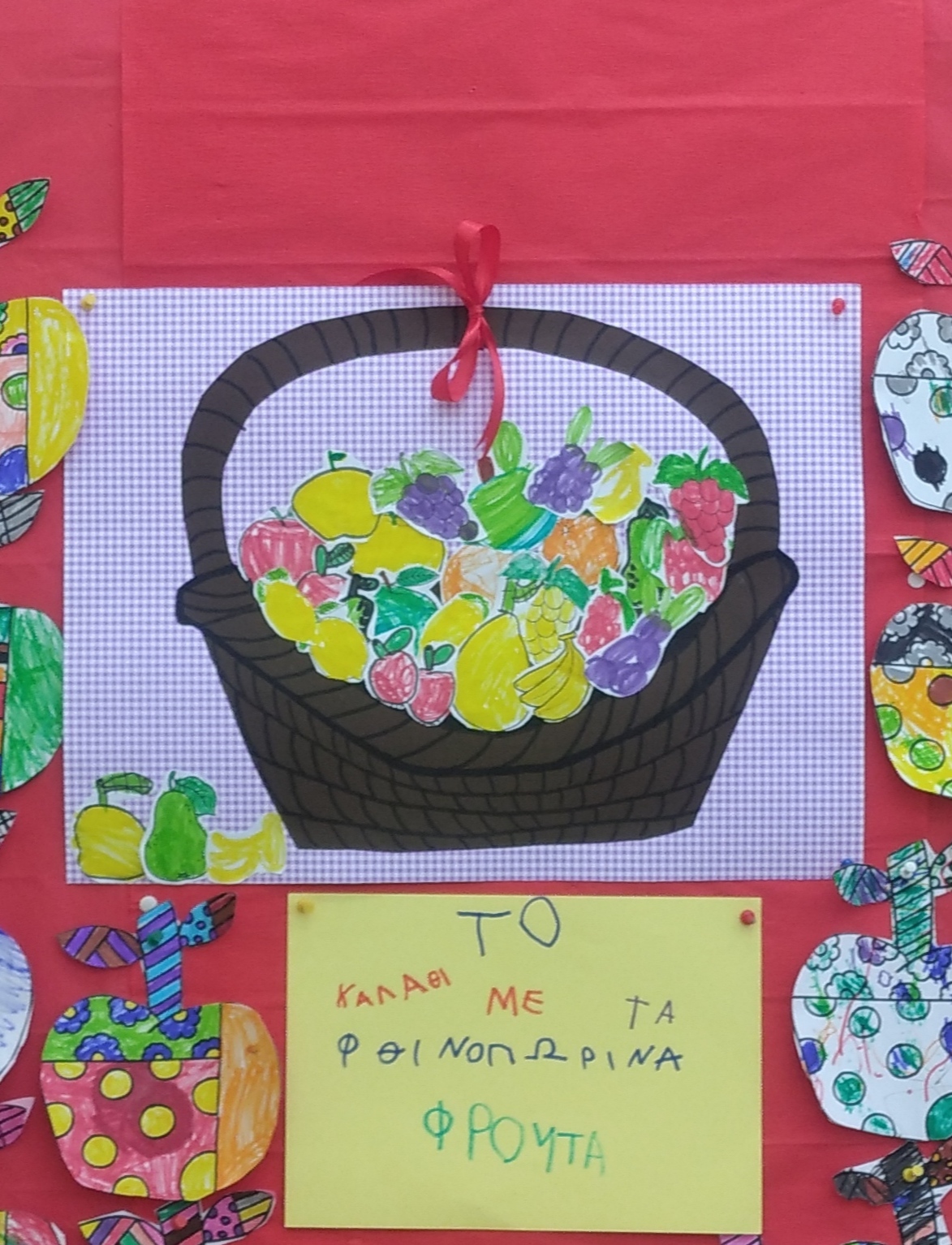 Μιλήσαμε για τα φρούτα της εποχής (φθινόπωρο), όπως το μήλο, το αχλάδι, το σταφύλι κ.α. Στις δραστηριότητες που επιλέξαμε, οι μαθητές χρησιμοποιήσαν διάφορες τεχνικές.