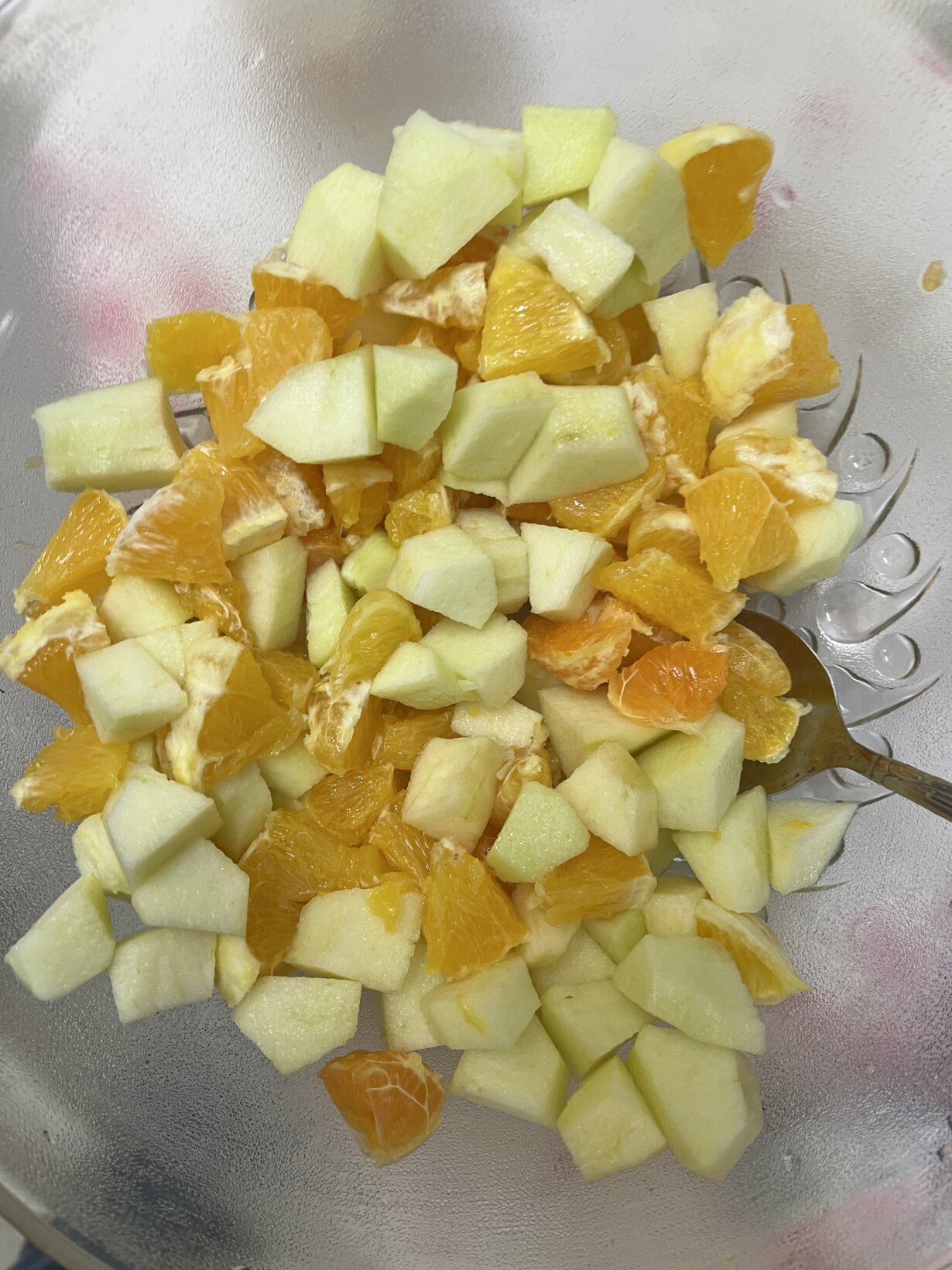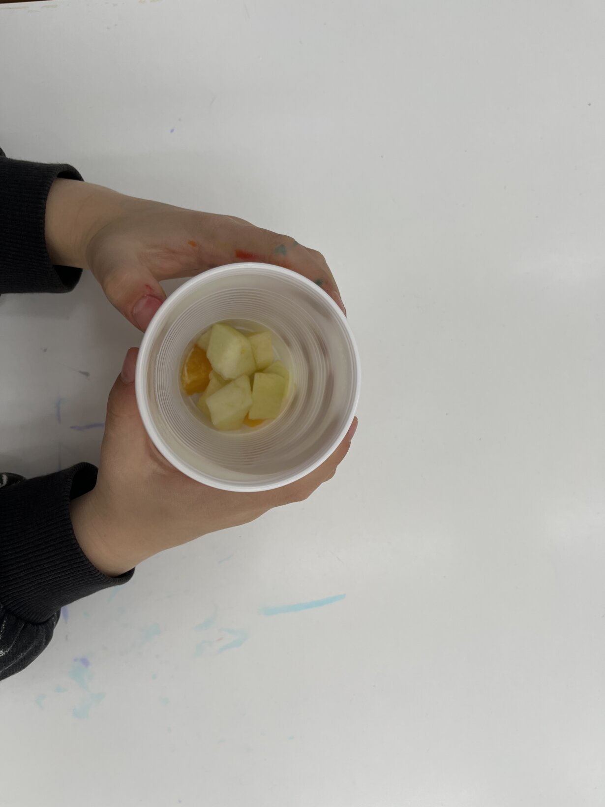 Τέλος, κόψαμε τα φρούτα σε μικρά κομματάκια, φτιάχνοντας τη φρουτοσαλάτα και μοιράστηκε ατομικά στους μαθητές, ώστε να ολοκληρωθεί η γευσιγνωσία μας χρησιμοποιώντας πια την γεύση και οι μαθητές να ξεχωρίσουν τα χειμερινά φρούτα. Τέλος, συζητήσαμε για τη σημαντικότητα των φρούτων στη ζωή μας.