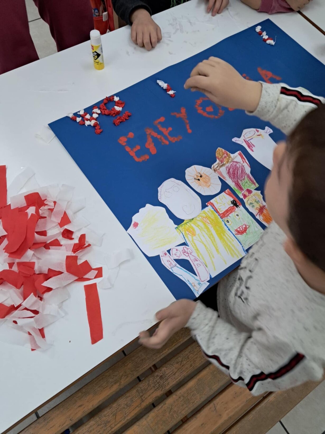Τα παιδιά ζωγράφισαν αυτή τη φορά τα δικά τους Ντενεκεδάκια και έφτιαξαν τη δική τους «Ντενεκεδούπολη», ενώ στη συνέχεια χρησιμοποιώντας τη λεπτή κινητικότητα τους, έκαναν κολάζ το σύνθημα «ΨΩΜΙ, ΠΑΙΔΕΙΑ, ΕΛΕΥΘΕΡΙΑ».