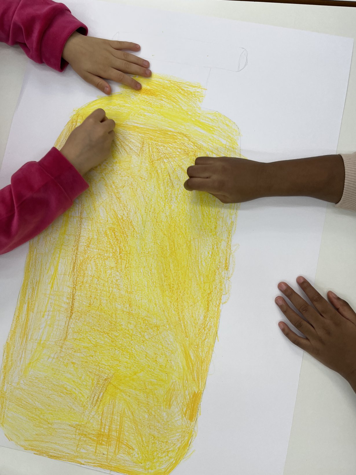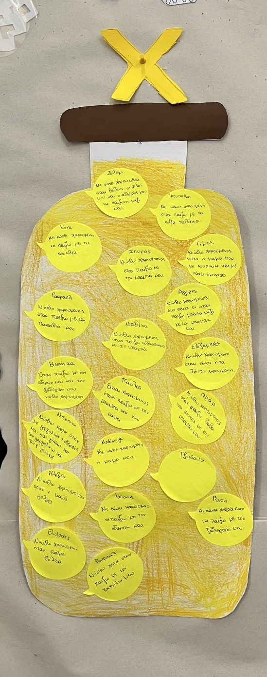 Τα παιδιά κατέγραψαν τις σκέψεις τους πάνω σε πράσινα συννεφάκια και τα κόλλησαν στο βάζο της ηρεμίας.