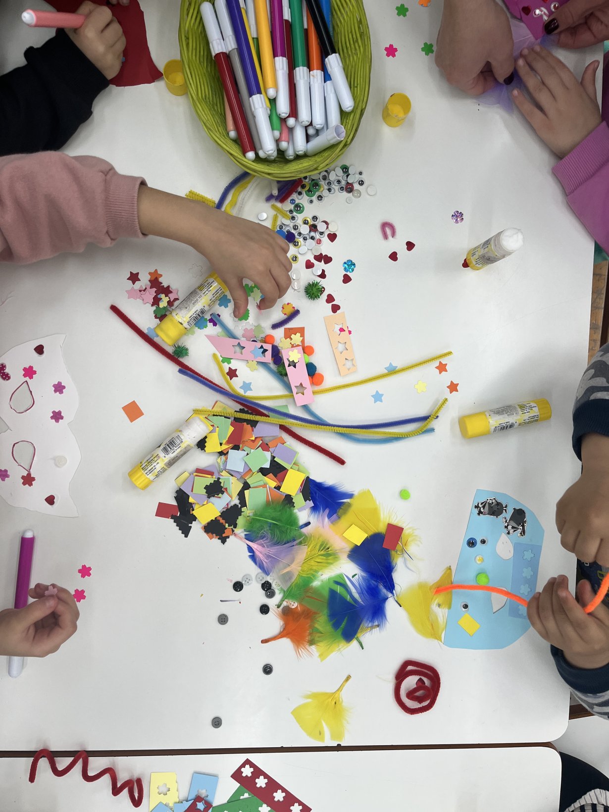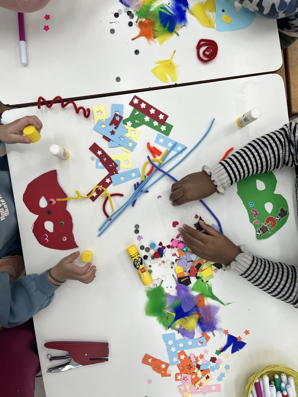 Ξεκινήσαμε με κατασκευές αποκριάτικων μασκών.  Τα παιδιά χρησιμοποίησαν φτερά, πούλιες, χαρτιά, κουμπιά, σύρματα πίπας και πολλή φαντασία για να φτιάξουν μοναδικές δημιουργίες.Η τάξη μας γέμισε χρώματα.