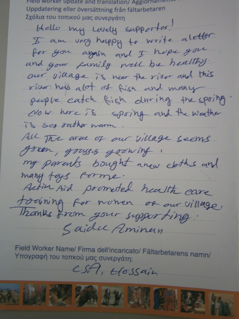 Στη συνέχεια, στη διάρκεια της σχέσης σας, θα λαμβάνεις δύο μηνύματα τον χρόνο από το παιδί που στηρίζεις. Μπορεί το παιδί να μην έχει ξαναπιάσει ποτέ μολύβι και ίσως σου στείλει κάτι πολύ απλό. Ένα φρούτο, ένα ζώο, μια καλύβα, ποτέ δεν ξέρεις τι θα είναι αυτό που θα θέλει να μοιραστεί μαζί σου. Εξαρτάται από την ηλικία και την εξοικείωση του παιδιού, οπότε κάθε μήνυμα είναι μοναδικό. Κάθε ζωγραφιά συνοδεύεται από ένα σύντομο μήνυμα από το παιδί για να μαθαίνεις τα νέα του. Ο τοπικός συνεργάτης της ActionAid θα μεταφέρει το μήνυμα του παιδιού στο χαρτί αν το παιδί δεν ξέρει αγγλικά ή δεν είναι αρκετά μεγάλο ώστε να γράψει. Κάθε δύο χρόνια σου στέλνουμε, επίσης, μία νέα φωτογραφία του παιδιού για να έχεις εικόνα του ενώ μεγαλώνει.