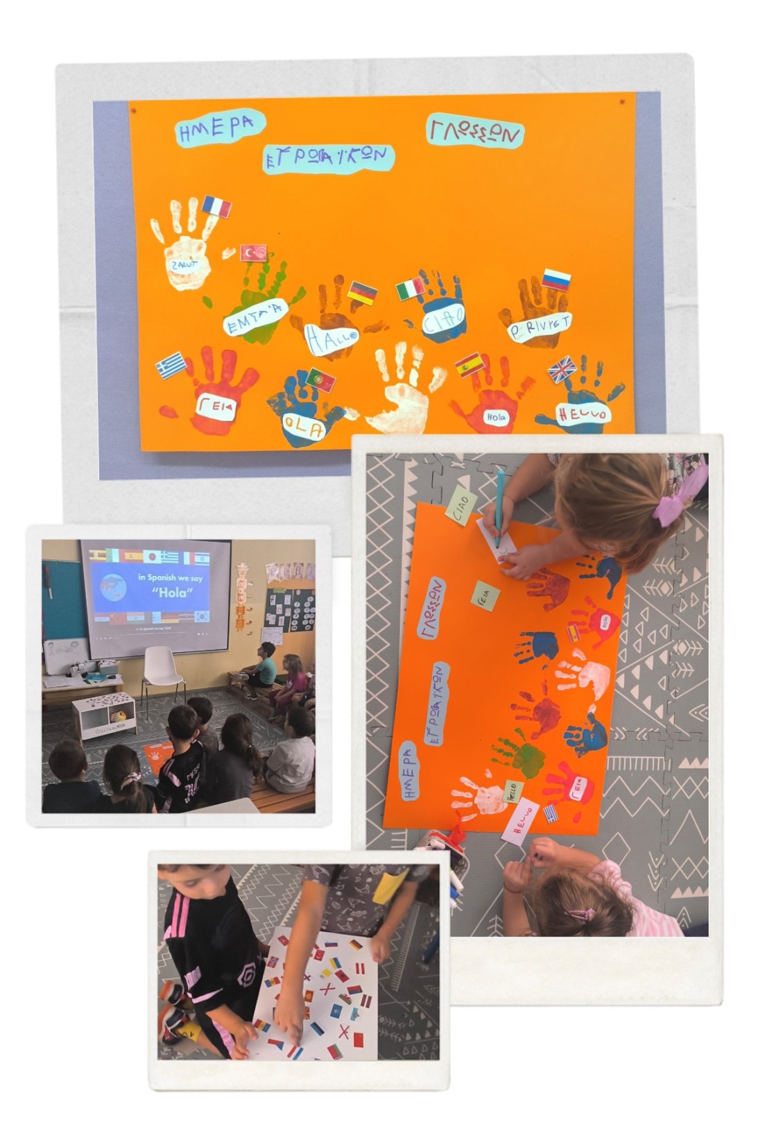 Την Παρασκευή 26 Σεπτεμβρίου γιορτάσαμε και την Ευρωπαϊκή Ημέρα Γλωσσών. Ακούσαμε χαιρετισμούς σε διάφορες γλώσσες, τραγουδήσαμε ξενόγλωσσα τραγούδια και «χαιρετηθήκαμε» σε όλες τις γλώσσες που γνωρίσαμε. Μιλήσαμε για το αν έχουμε συμμαθητές που μιλούν διαφορετική γλώσσα από τη δική μας και δημιουργήσαμε μια πολύχρωμη αφίσα με τη λέξη «γεια» σε πολλές γλώσσες.