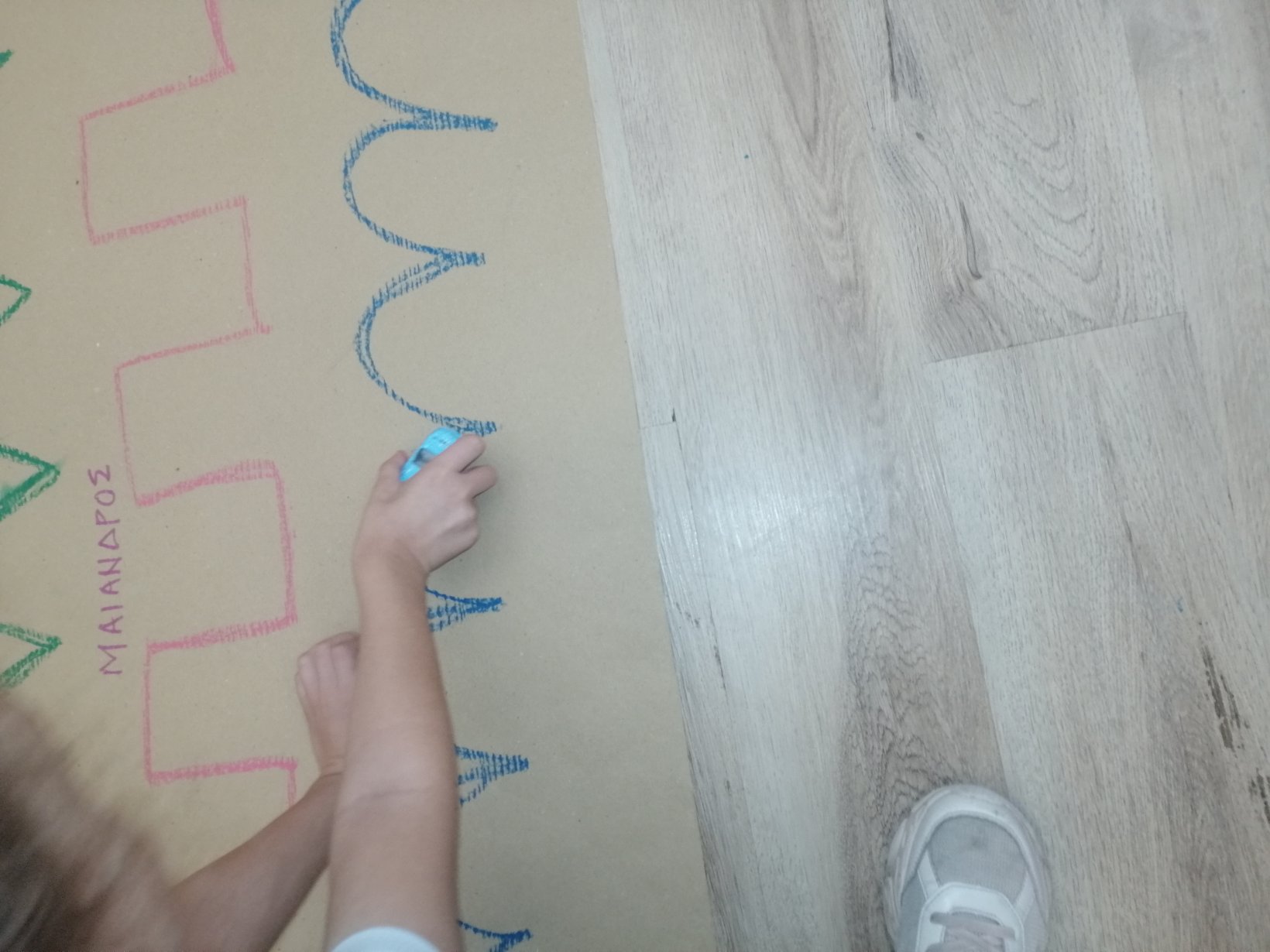 Κυματιστή γραμμή: κάναμε τα χέρια μας κύματα και ζωγραφίσαμε τη θάλασσα της Λιάς.