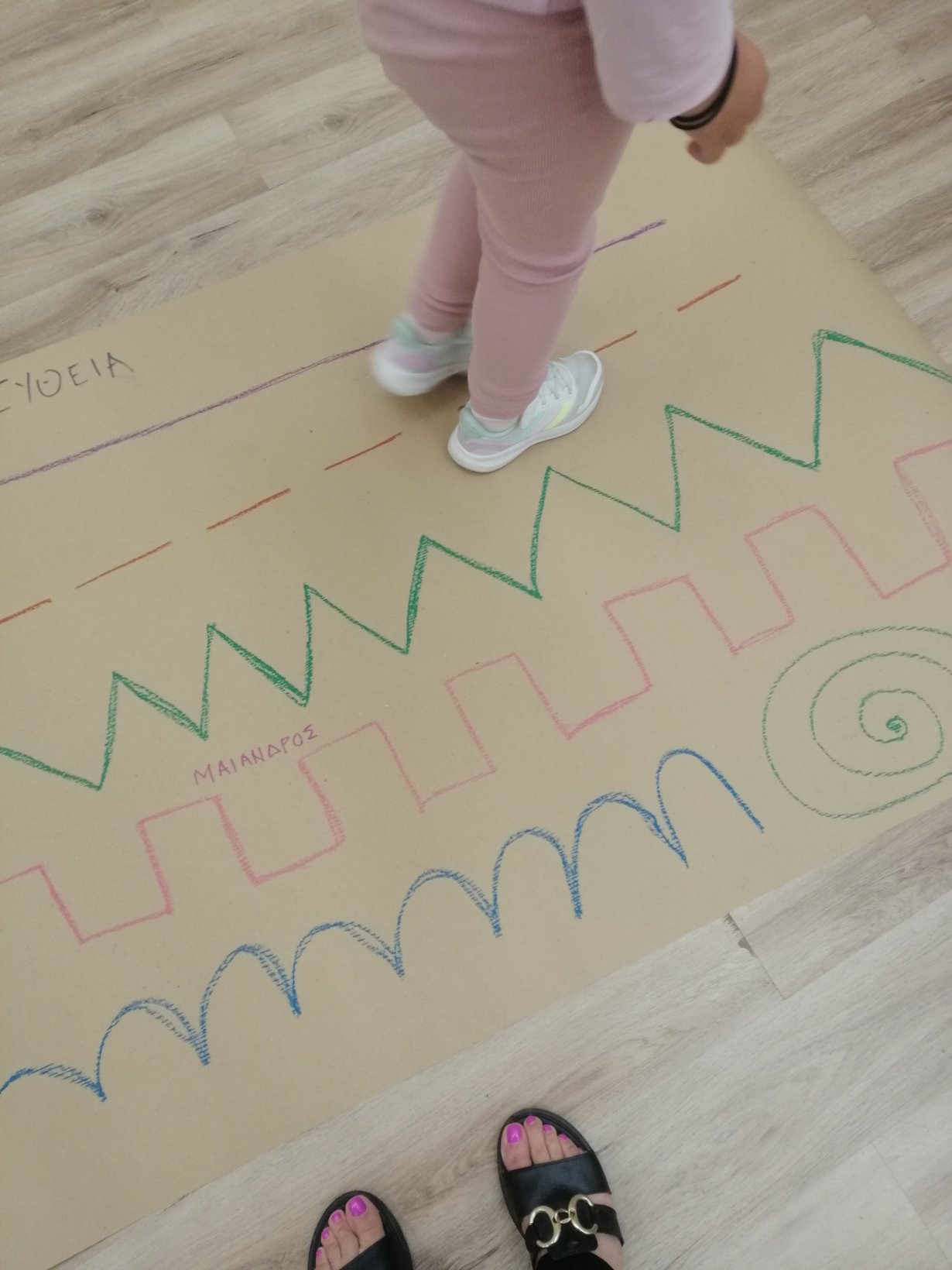 Στη συνέχεια δημιουργήσαμε έναν “Χάρτη των Γραμμών”, όπου όλες οι γραμμές ζούσαν αρμονικά: ευθείες δρόμοι, κυματιστές θάλασσες, τεθλασμένα βουνά και καμπύλες ουράνια τόξα. Συζήτηση και ανακαλύψεις
