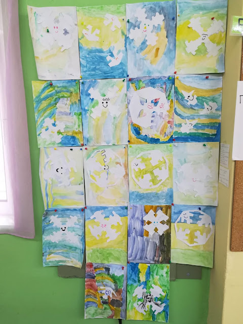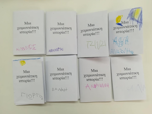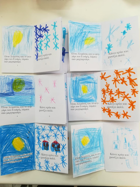 Ως επέκταση των παραπάνω δραστηριοτήτων οι μαθητές κλήθηκαν να δημιουργήσουν μια ιστορία που να περιλαμβάνει την παροιμία, τις χιονονιφάδες και την παραπάνω έκφραση για τον καιρό. Το αποτέλεσμα είναι όντως αξιόλογο!!!!!