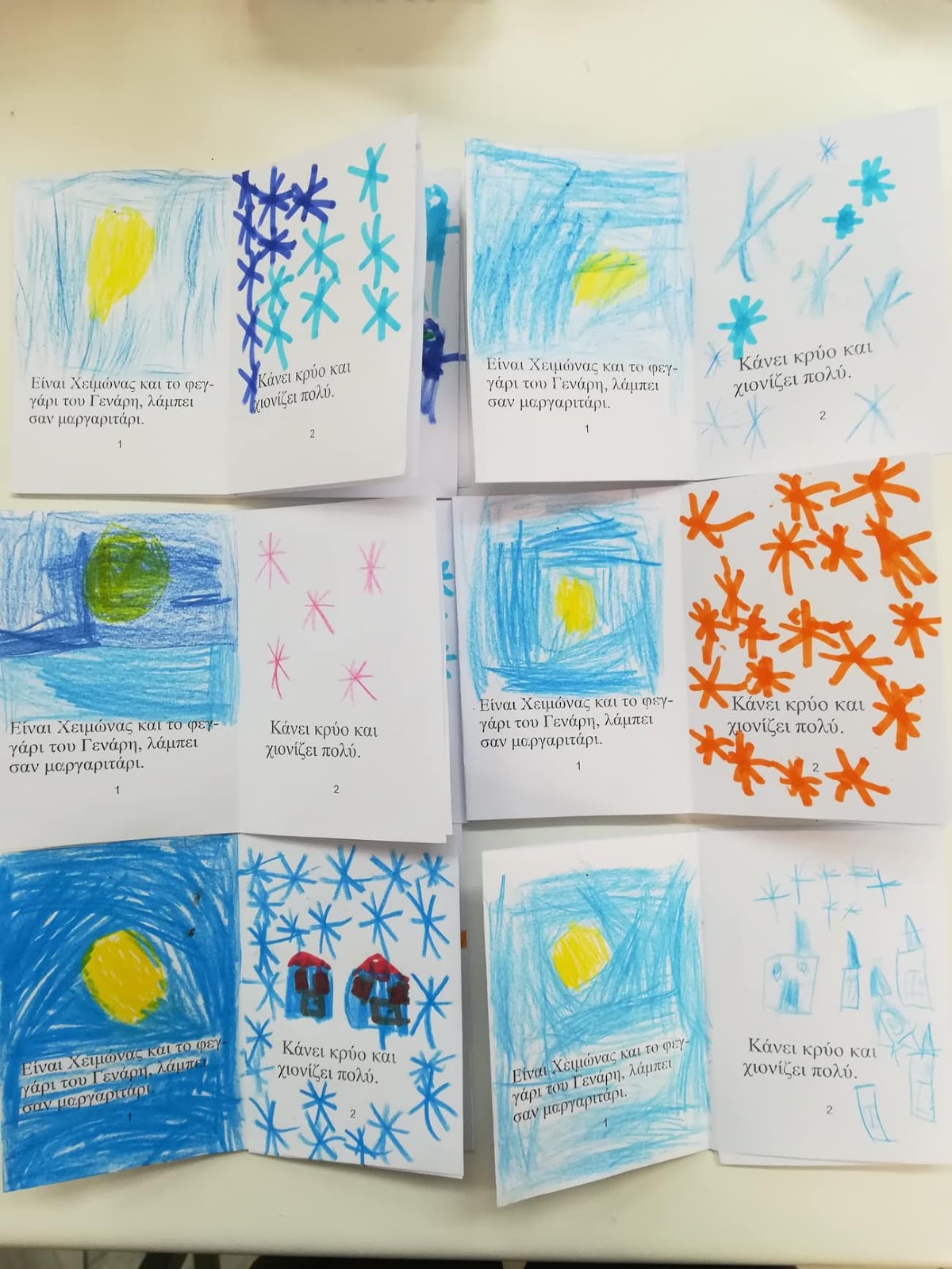 Οι μαθητές έπλασαν τον ουρανό με τα αστέρια και το φεγγάρι του Γενάρη με πλαστελίνη. “Έχτισαν” την πόλη, επιλέγοντας με τη σειρά και τοποθετώντας τα τουβλάκια και τα δεντράκια πάνω στον τάπητα. Δημιούργησαν τη χιονόπτωση και κατασκεύασαν τον ήλιο με τα δόντια και τον χιονάνθρωπο από πλαστελίνη κατά ομάδες.