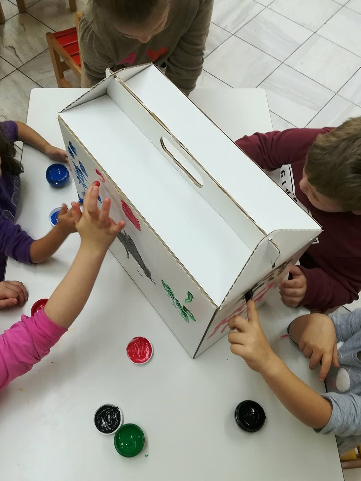 Η διαπίστωση ότι τα συναισθήματα θα μπορούσαν να έχουν όλα τα χρώματα ήρθε αβίαστα γι αυτό κι εμείς αποφασίσαμε και χρωματίσαμε την βαλίτσα με πολλά χρώματα. Χρησιμοποιήσαμε δαχτυλομπογιές και μαρκαδόρους.