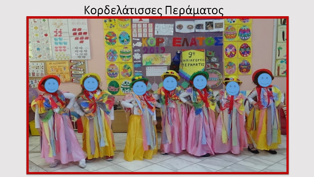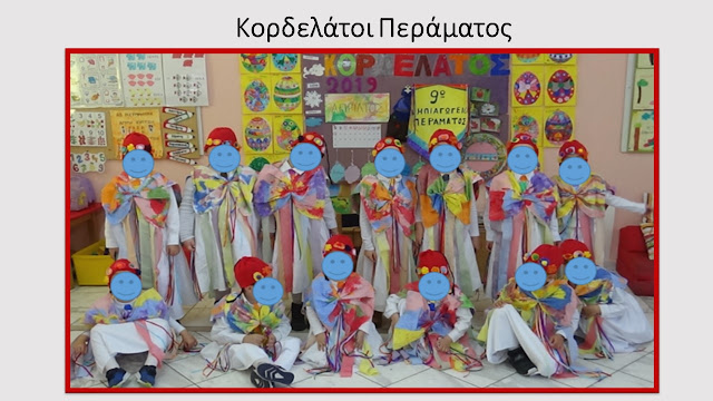 Ακολούθησε η προβολή του βίντεο με την παρουσίαση των Κορδελάτων από τη Νάξο, που είχα ετοιμάσει με το τμήμα μου, το σχολικό έτος 2018-2019. Τα παιδιά κατενθουσιάστηκαν με την φορεσιά, τα χρώματα, τις κορδέλες, τα μαντήλια. Ήταν τα ίδια τα παιδιά που ζήτησαν να ντυθούν κι αυτά Κορδελάτοι και Κορδελάτισσες, κι έτσι…..ξεκινήσαμε.