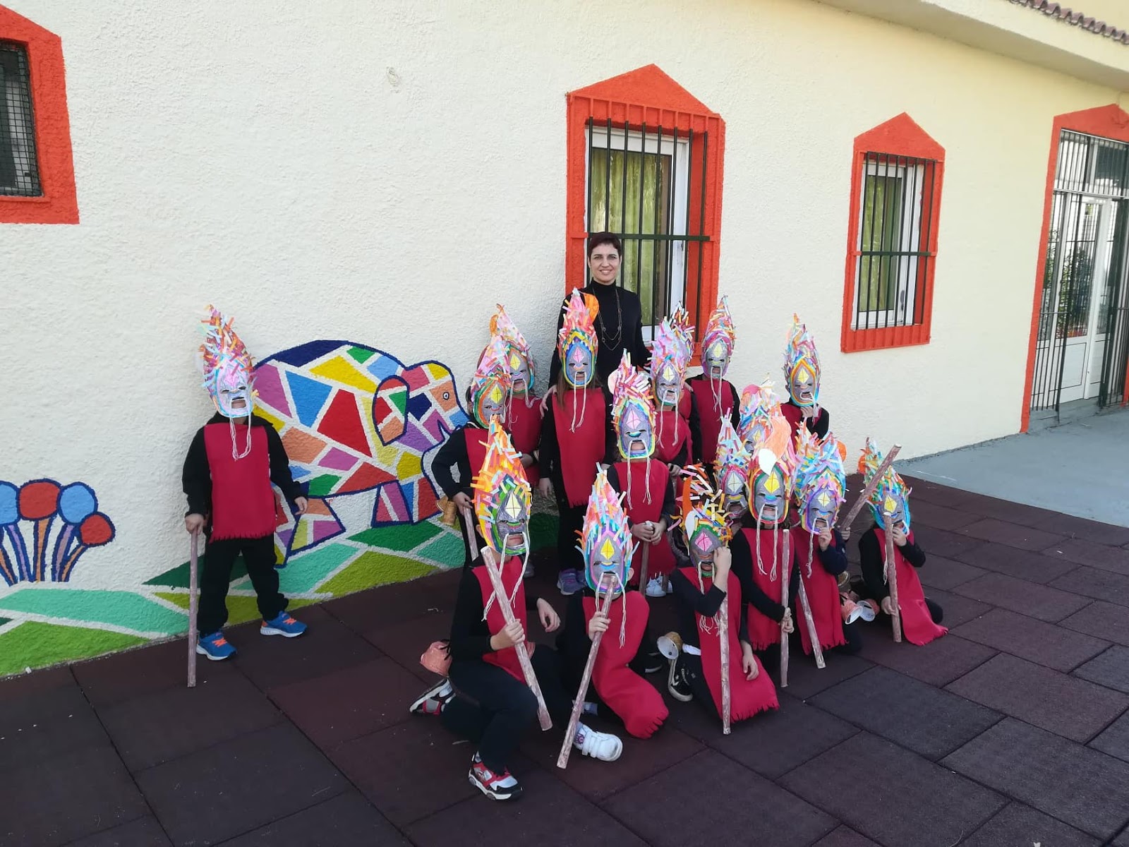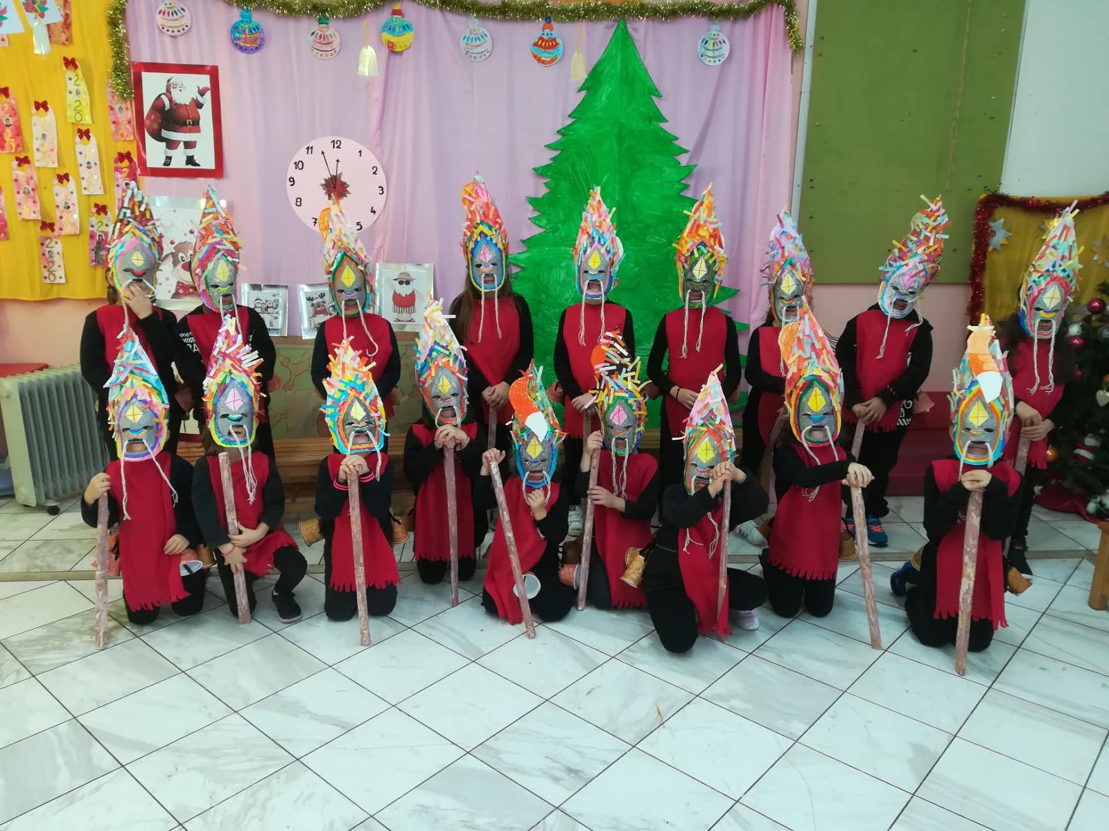 Τα αγόρια έφτιαξαν τις μάσκες,τις έβαψαν με μαύρο, χρυσό και κόκκινο χρώμα και στην κορυφή έκοψαν κ έβαλαν πανιά.Τα κορίτσια έβαψαν και έκοψαν λουλούδια και κορδέλες και διακόσμησαν τη δική τους μάσκα.Επισης,τα αγόρια έκοψαν κ έβαψαν τα σπαθιά τους και τα πούλια τους που είναι στο γιλέκο τους.Τα παιδιά που ήταν οι μουσικοί έφτιαξαν τα μουσικά τους όργανα (ζουρνάς και νταούλι) με τους γονείς τους.Οι γονείς επίσης, βοήθησαν με το να μας φέρουν μαντήλια και παραμάνες για τις φορεσιές μας.