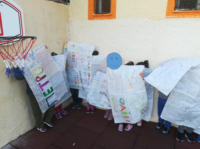 Προτού περάσουμε στην διαδικασία της “ύφανσης”, έχοντας βέβαια συζητήσει ότι τα παλιότερα χρόνια συνηθίζονταν να στολίζουν υφαντά στους τοίχους, για να πετυχαίνουν πιο υψηλή θερμοκρασία μέσα στο σπίτι τον χειμώνα, βγήκαμε, που αλλού, στην καινούρια μας αυλή να παίξουμε με τις αφίσες μας.