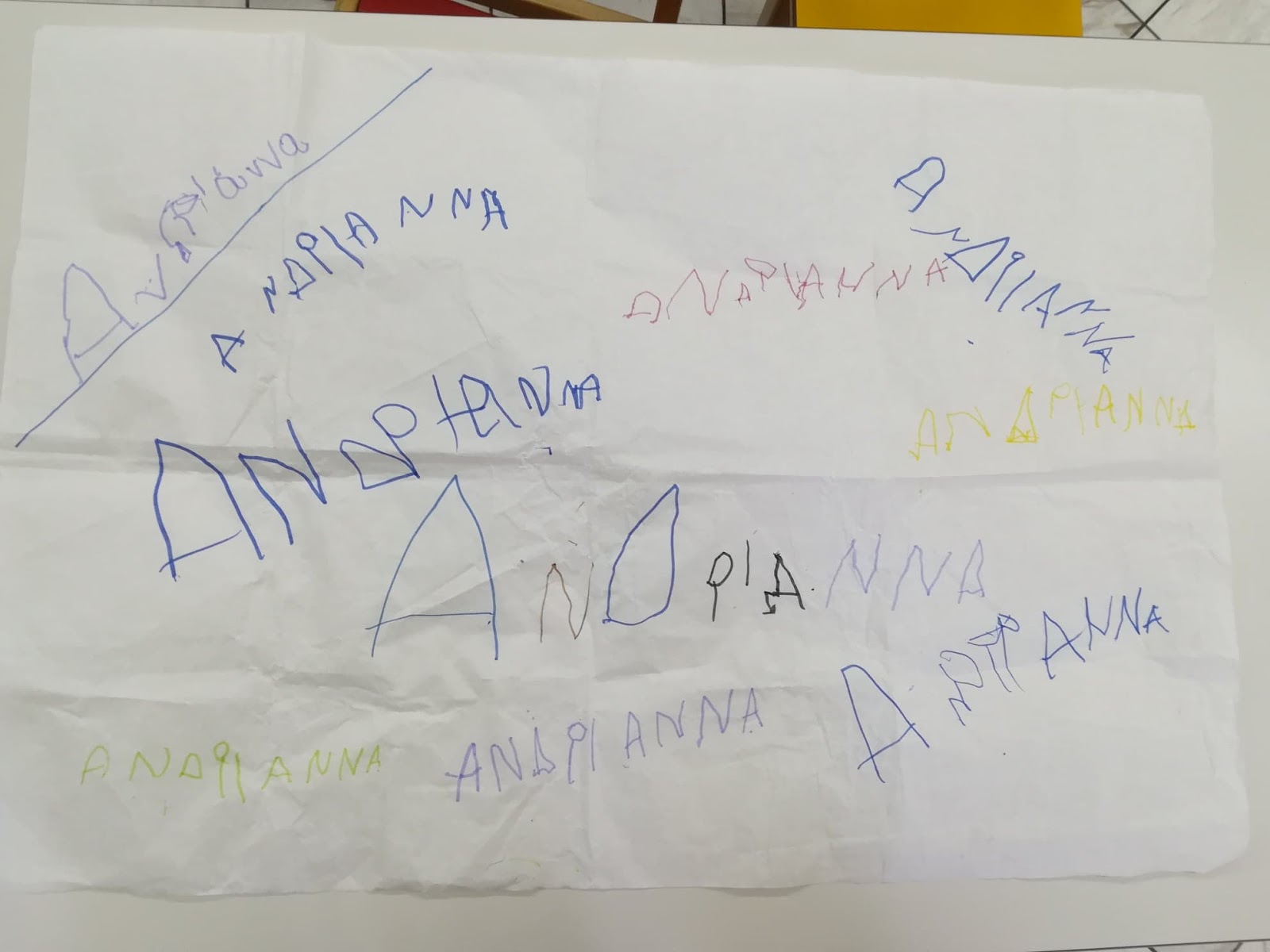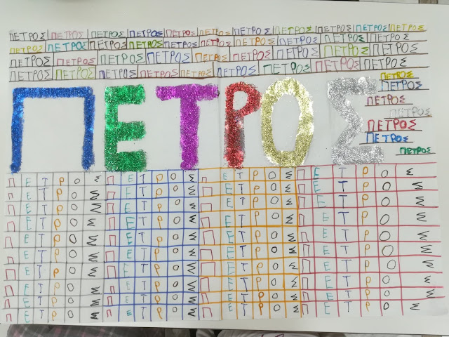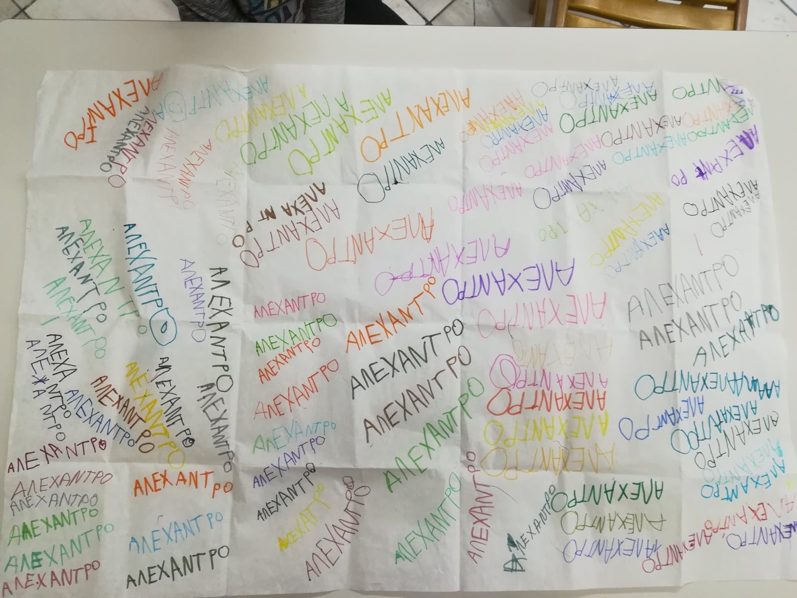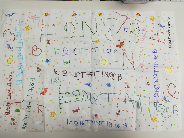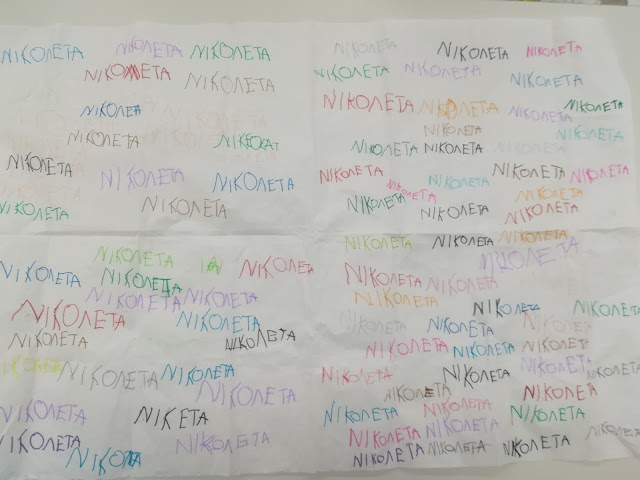Πρωταρχικός στόχος της δράσης είναι βέβαια να μάθουν οι μαθητές μου να γράφουν το όνομα τους για να μπορούν να υπογράφουν τις εργασίες τους καθημερινά. Στην αρχή της προηγούμενης εβδομάδας μοιράστηκαν στα παιδιά από ένα μεγάλο κομμάτι ριζόχαρτο, το οποίο κλήθηκαν σε καθημερινή βάση, να γράφουν το όνομα τους, με διάφορα χρώματα. Το ριζόχαρτο τους ζητήθηκε να επιστραφεί την Παρασκευή, προκειμένου να υφάνουμε το χαλί μας, το διακοσμητικό. Η προθεσμία παρατάθηκε μέχρι και σήμερα για όσα παιδιά δεν είχαν προλάβει. Παρακάτω παρατηρήστε τις αξιόλογες προσπάθειες των μικρών μου φίλων, να μπουν στον κόσμο της γραφής.