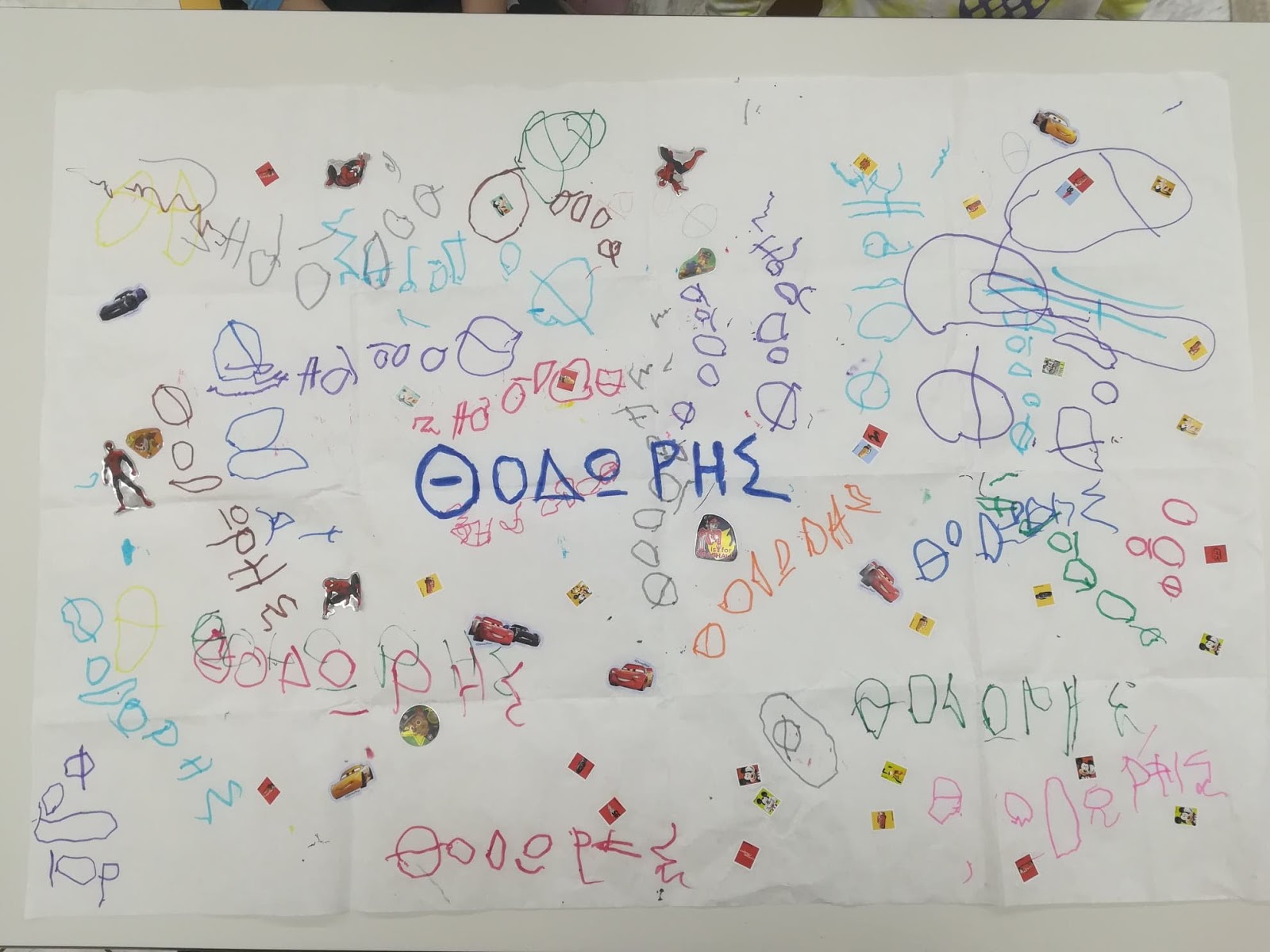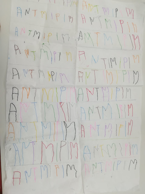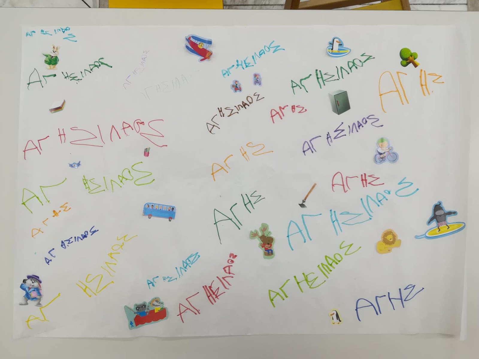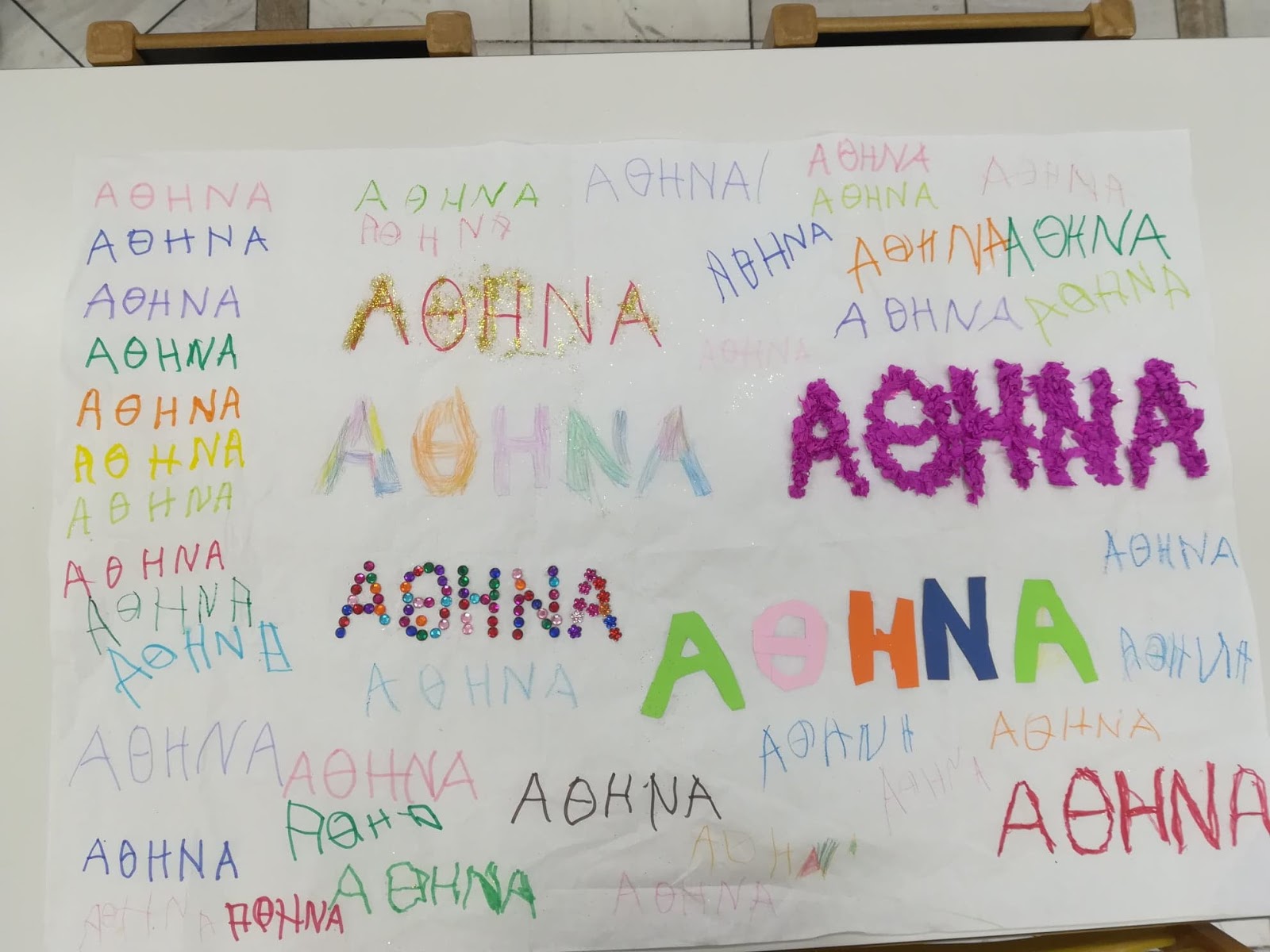 Πρωταρχικός στόχος της δράσης είναι βέβαια να μάθουν οι μαθητές μου να γράφουν το όνομα τους για να μπορούν να υπογράφουν τις εργασίες τους καθημερινά. Στην αρχή της προηγούμενης εβδομάδας μοιράστηκαν στα παιδιά από ένα μεγάλο κομμάτι ριζόχαρτο, το οποίο κλήθηκαν σε καθημερινή βάση, να γράφουν το όνομα τους, με διάφορα χρώματα. Το ριζόχαρτο τους ζητήθηκε να επιστραφεί την Παρασκευή, προκειμένου να υφάνουμε το χαλί μας, το διακοσμητικό. Η προθεσμία παρατάθηκε μέχρι και σήμερα για όσα παιδιά δεν είχαν προλάβει. Παρακάτω παρατηρήστε τις αξιόλογες προσπάθειες των μικρών μου φίλων, να μπουν στον κόσμο της γραφής.
