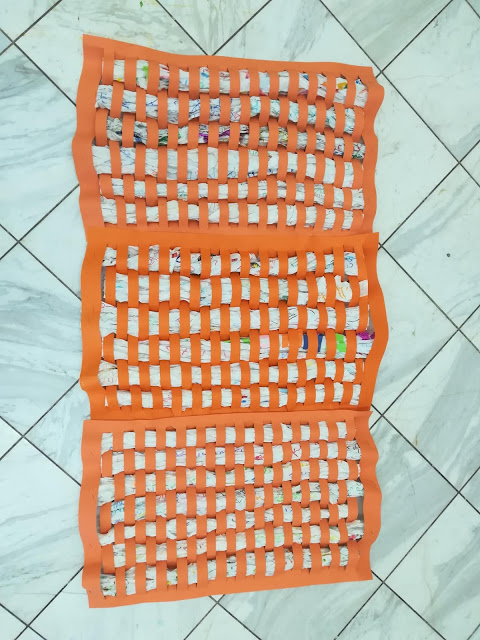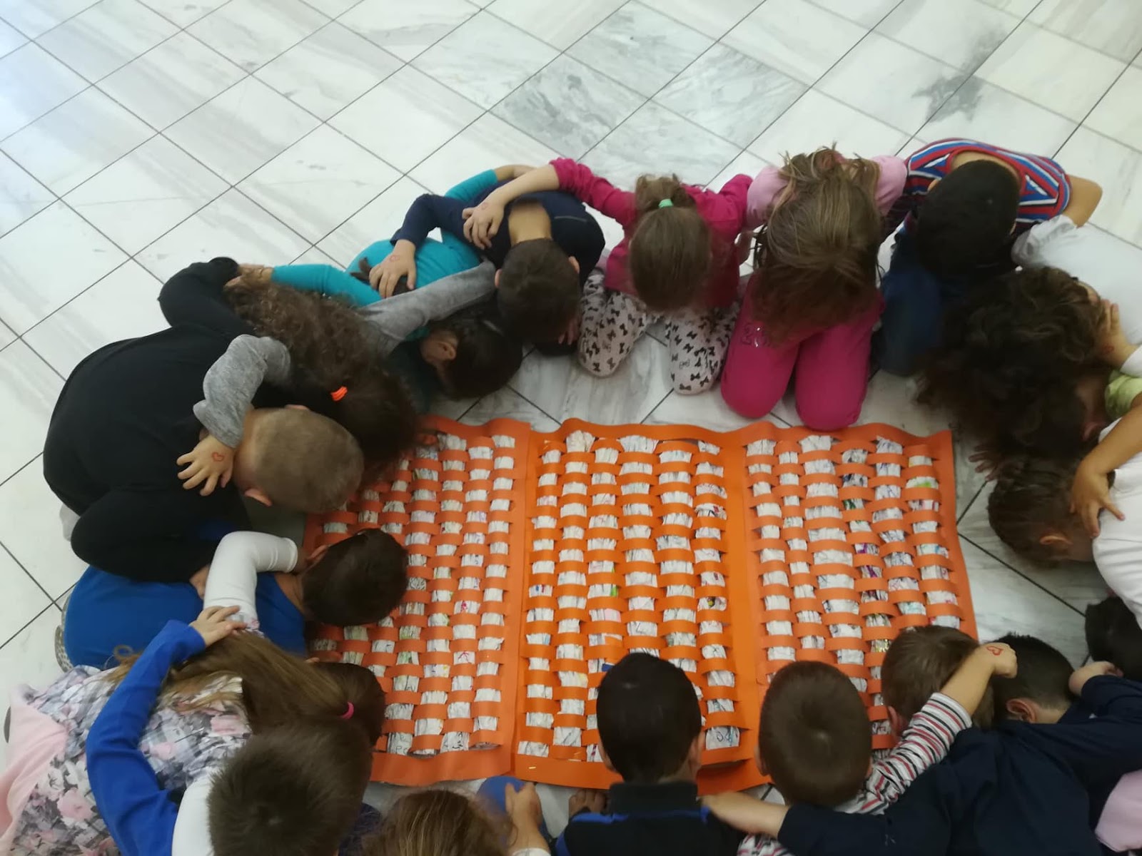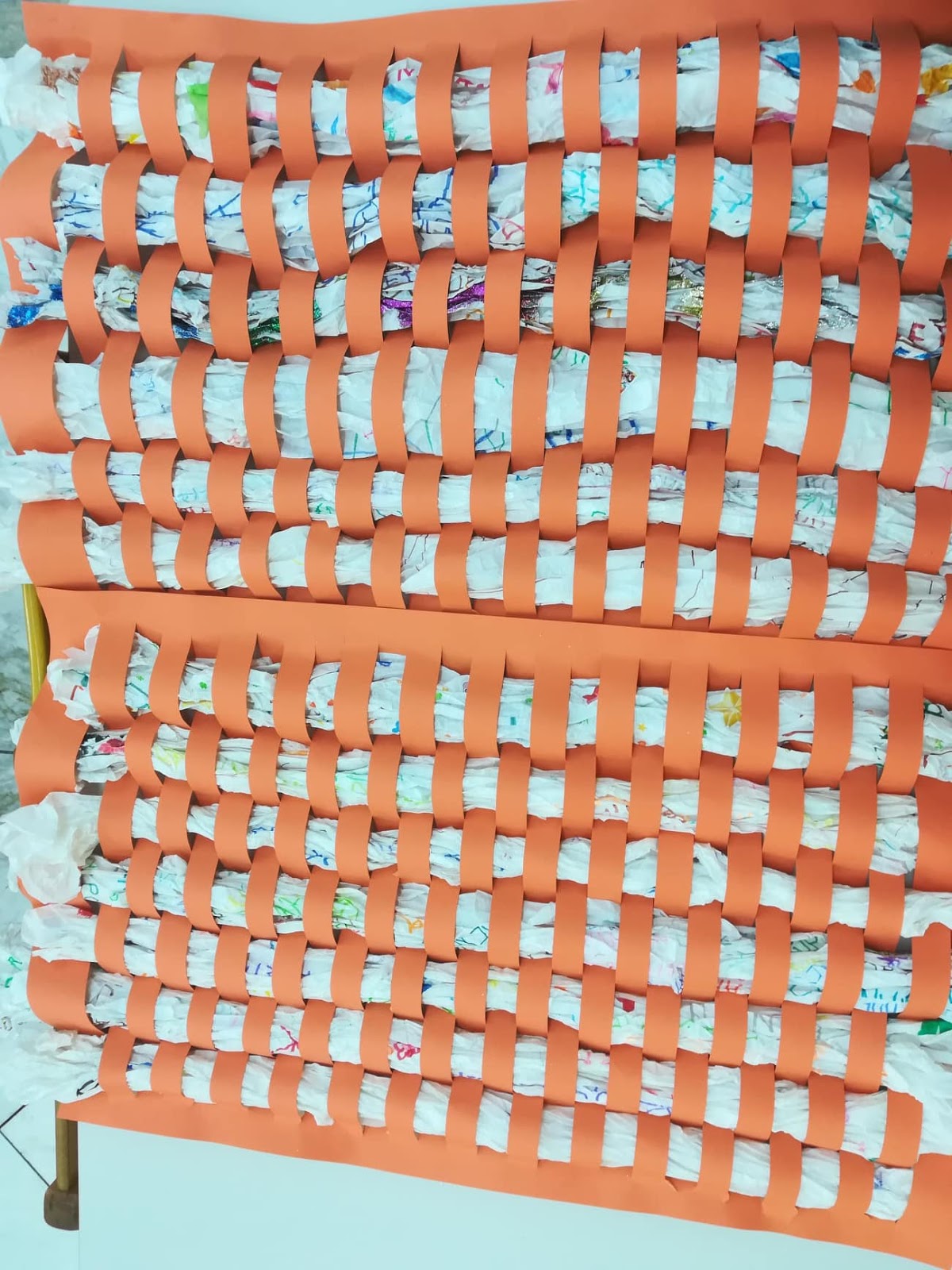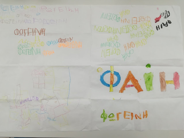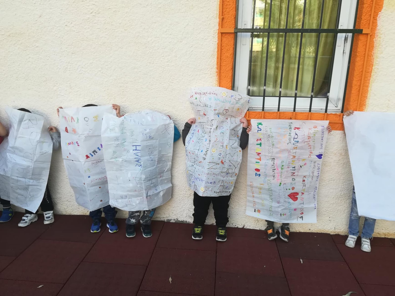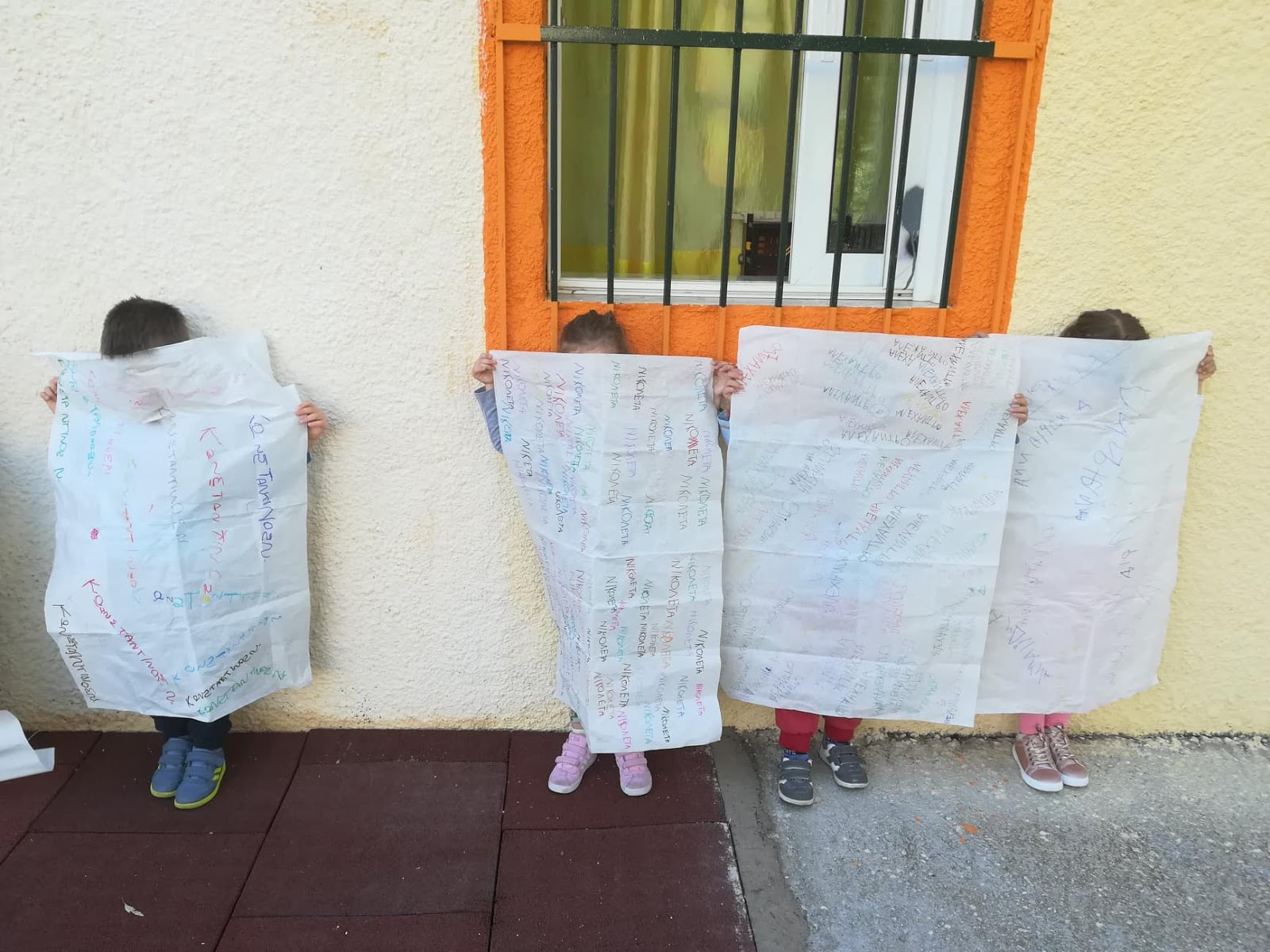 Προτού περάσουμε στην διαδικασία της “ύφανσης”, έχοντας βέβαια συζητήσει ότι τα παλιότερα χρόνια συνηθίζονταν να στολίζουν υφαντά στους τοίχους, για να πετυχαίνουν πιο υψηλή θερμοκρασία μέσα στο σπίτι τον χειμώνα, βγήκαμε, που αλλού, στην καινούρια μας αυλή να παίξουμε με τις αφίσες μας.